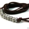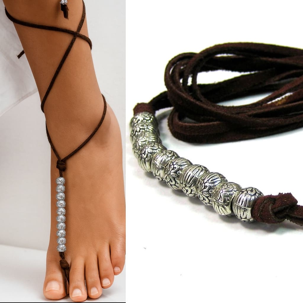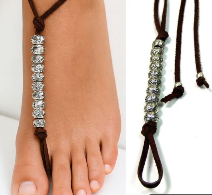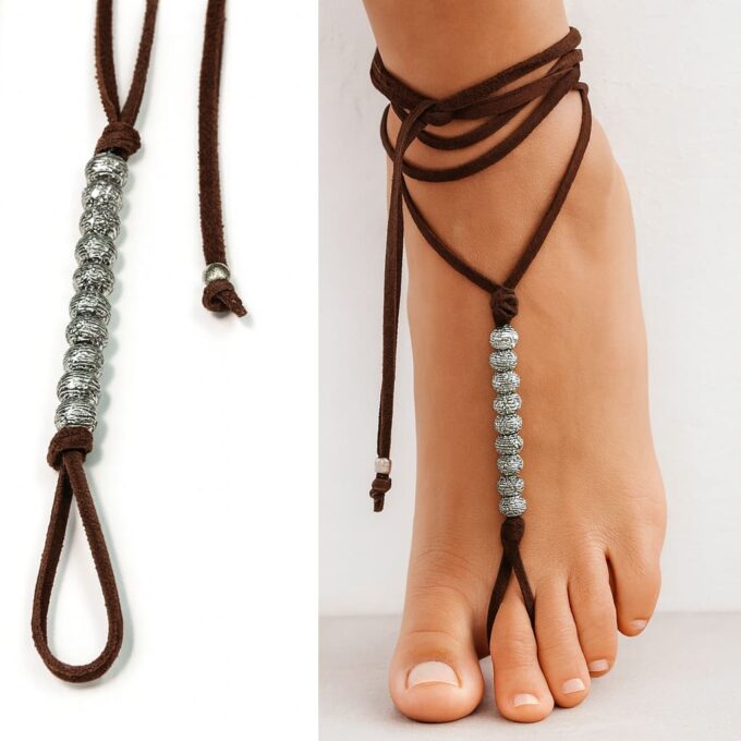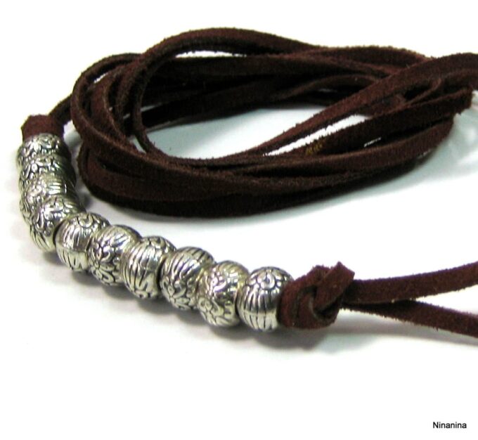 Ce bracelet de cheville brésilien est confectionné à la main avec un lacet en daim souple et des perles argentées sculptées au look ethnique.