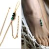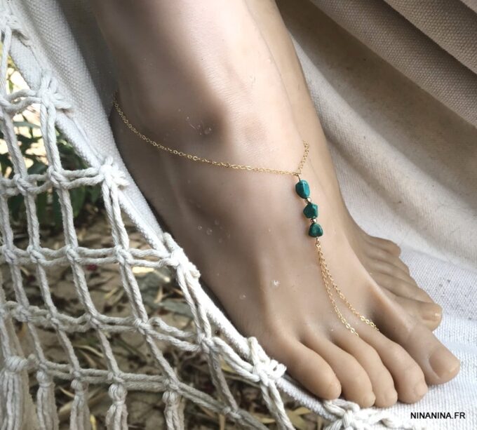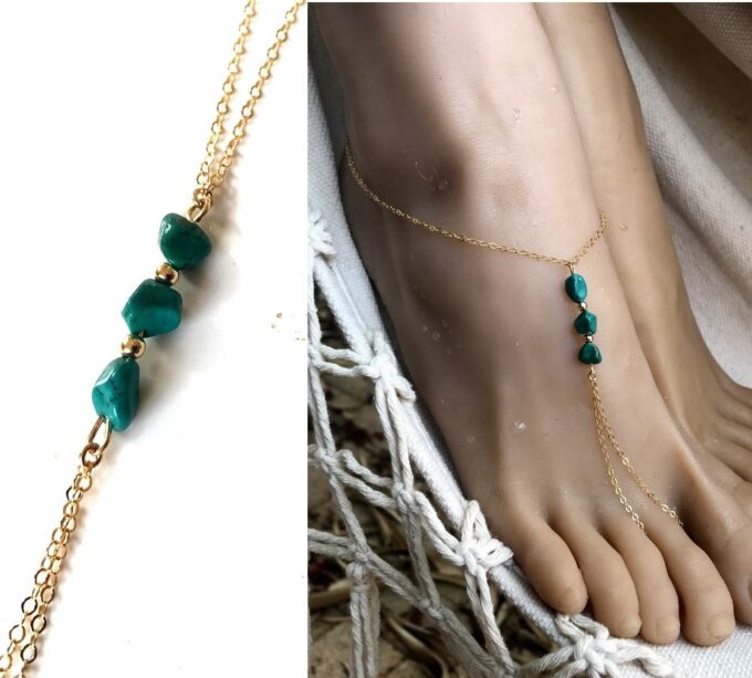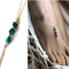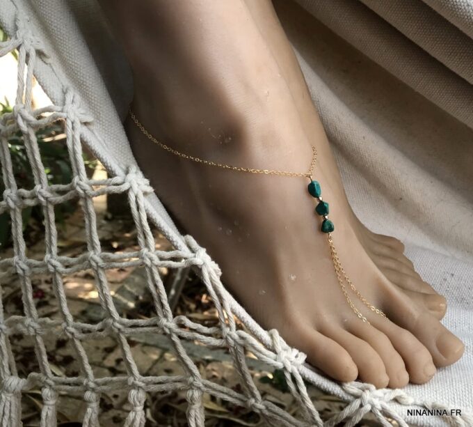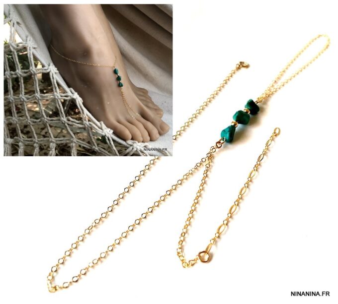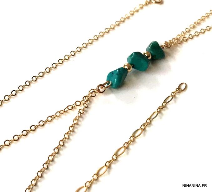 Chaine de pied Plaqué Or femme Turquoise naturelle composée de 3 turquoises véritables et de 2 perles rondes en plaqué or 18 carats montées sur une chainette en plaqué or 14 carats gold filled.