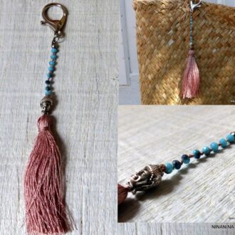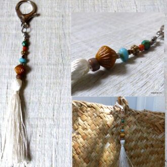 Ce Porte clé boheme et très tendance est unique et fabriqué à la main, de façon artisanale dans notre atelier en France. Il est terminé par un gros fermoir mousqueton.
