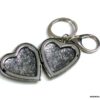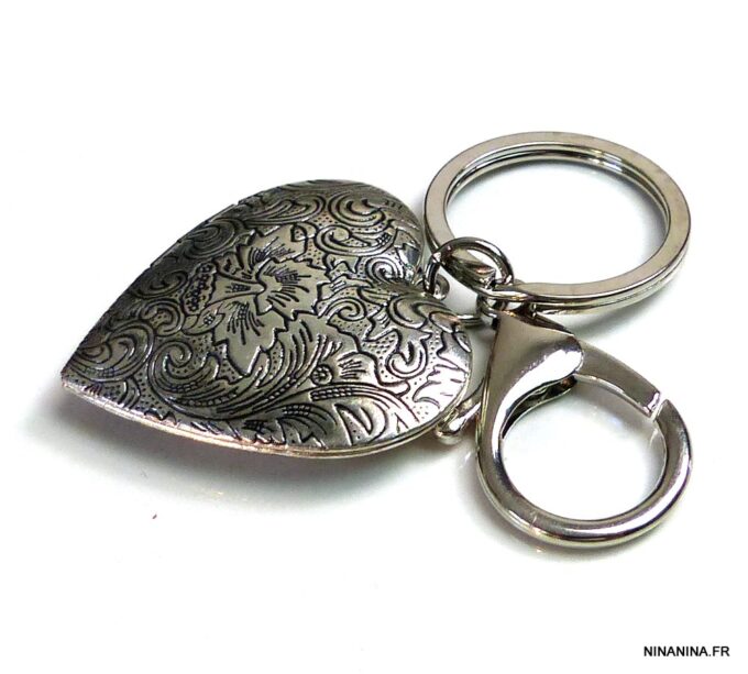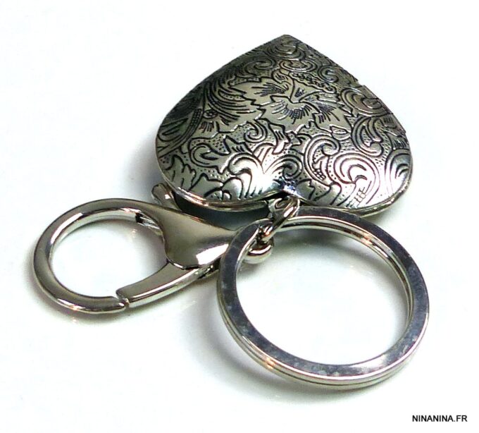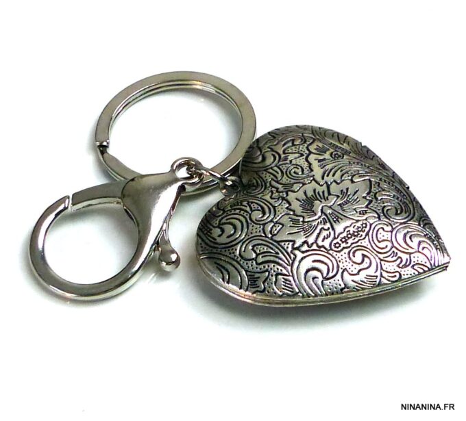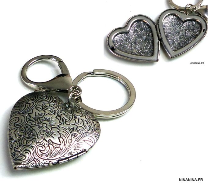 Bijou de sac – porte clé coeur porte photo composé d’un pendentif porte-photo en métal argenté en forme de coeur monté sur un mousqueton et un anneau de porte-clé en métal argenté. Dim du pendentif : 4,2 X 4 cm. Longueur : 8 cm environ. Livré dans sa pochette d’organza