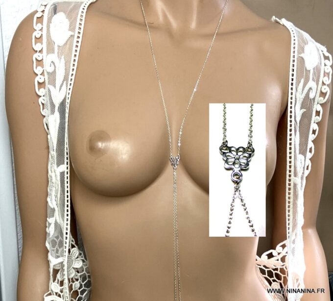 Ce bijou intime femme en argent 925 de grande qualité est unique et fabriquée à la main, de façon artisanale dans notre atelier en France. Il s’agit d’une pièce faite sur mesure et fabriquée de façon artisanale. Pour s’adapter au mieux à vos mensurations, quelques mesures sont à nous communiquer. Pour information, la longueur du collier : 67 cm. Longueur des deux chaines : 47 cm env.