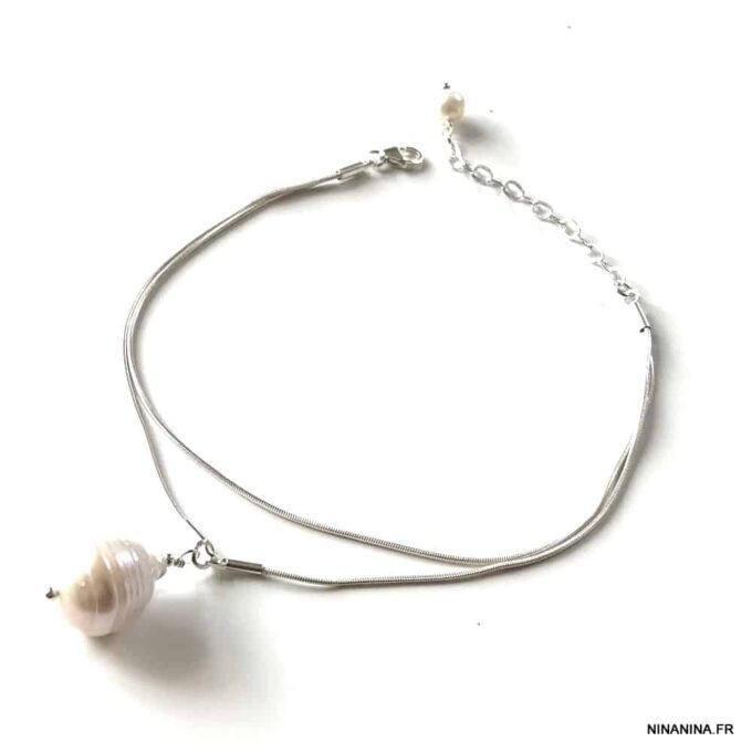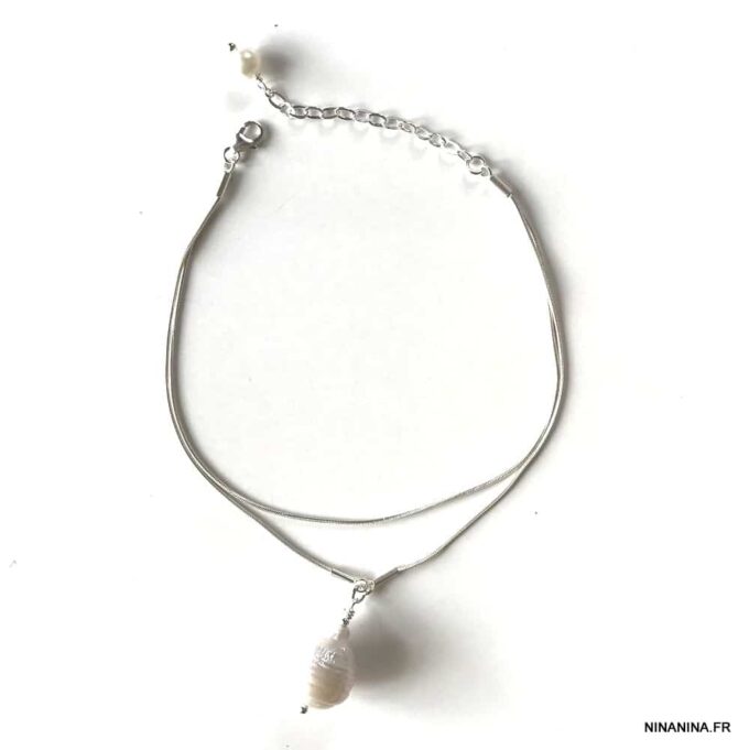 Découvrez ce Bijou mariée bohème cheville perle baroque Argent composée d’une perle naturelle baroque montée sur une Chaîne serpent en Argent 925 maille à enrouler autour de la cheville.