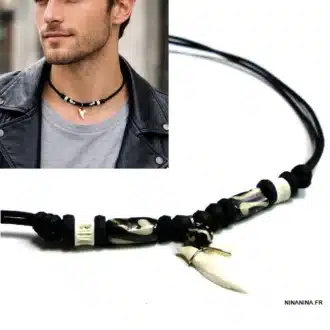 Collier dent de requin véritable pour homme fait main en France avec perles blanches et noires