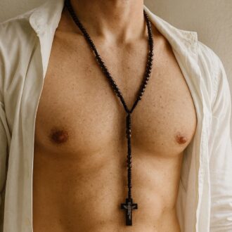 Collier Chapelet homme pendentif croix chrétienne et perles en bois marron
