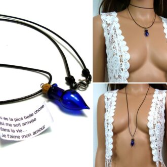 Collier flacon parfum homme vide en verre sur cordon cuir