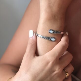 Il peut également être fermé à l’aide d’un fermoir, il allie le style « fermé » tout en facilitant sa mise en place sur le poignet comme un style « ouvert ». Il est fortement recommandé pour les personnes aux articulations fortes désirant un bijou ajusté.