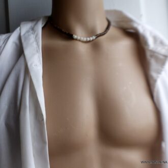 - Style moderne et minimaliste : Un collier ras-du-cou en perles associé à une chemise ouverte pour un effet contemporain.