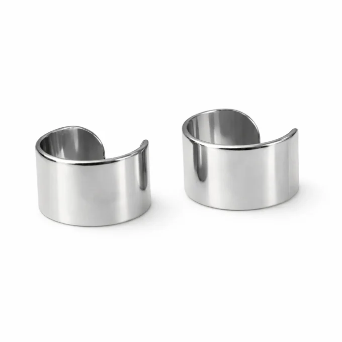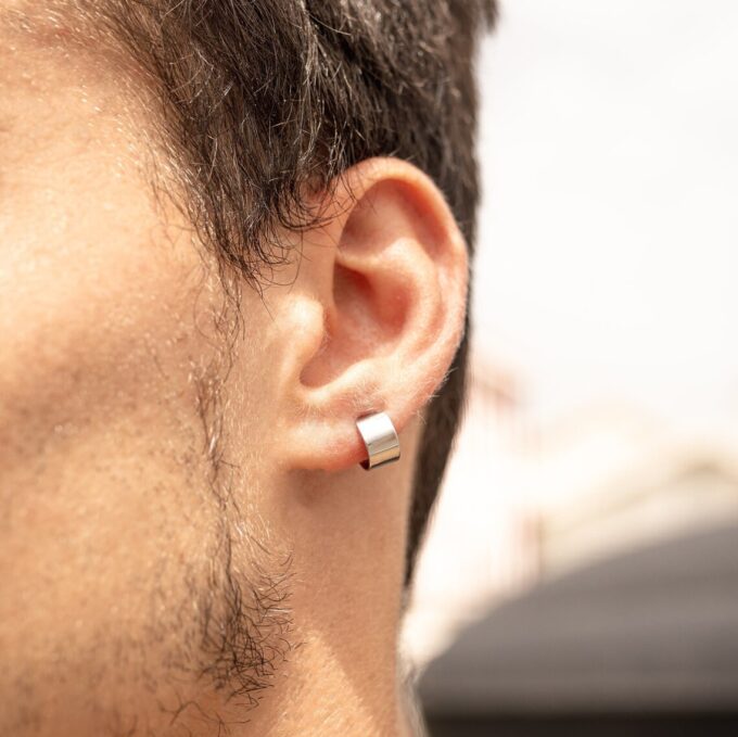 Ear cuff large en acier inoxydable argenté, conçu pour épouser le contour du lobe et habiller l’oreille avec un style moderne et affirmé, sans piercing supplémentaire.