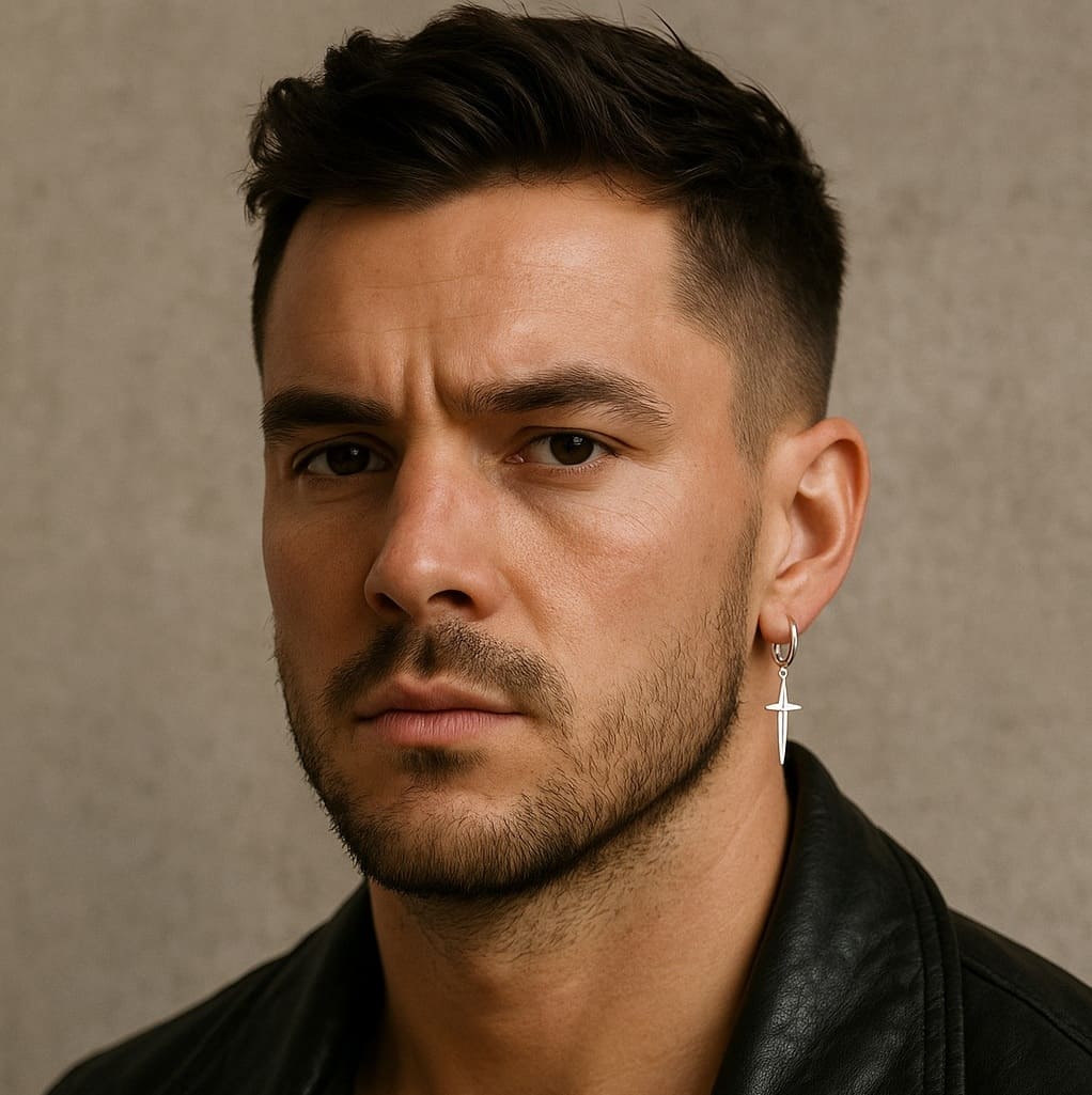 Boucle d’oreille artisanale pour homme en argent 925, ornée d’une croix élégante avec 4 pointes pour un style moderne, affirmé et symbolique. Un bijou unique, fait main, au caractère résolument masculin.