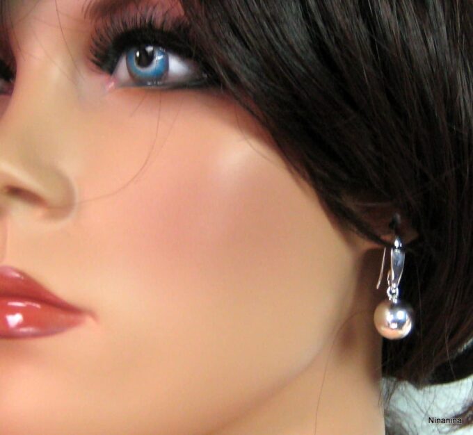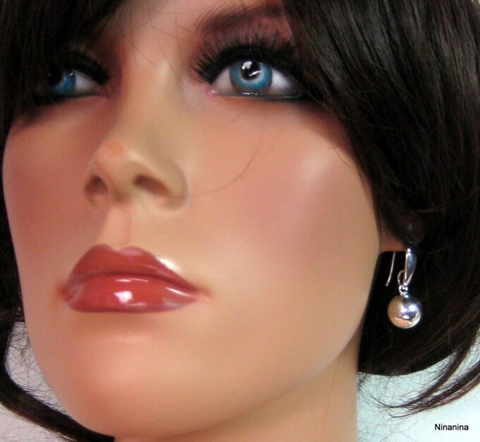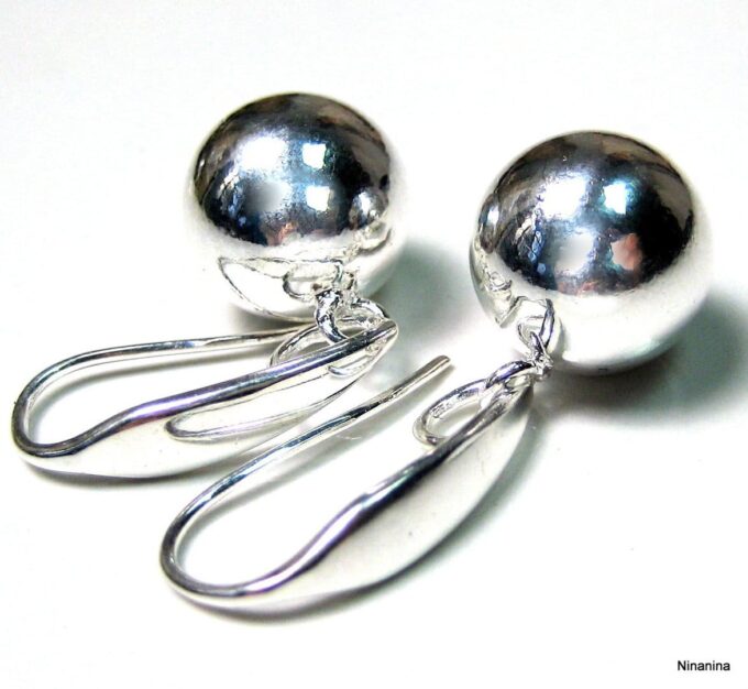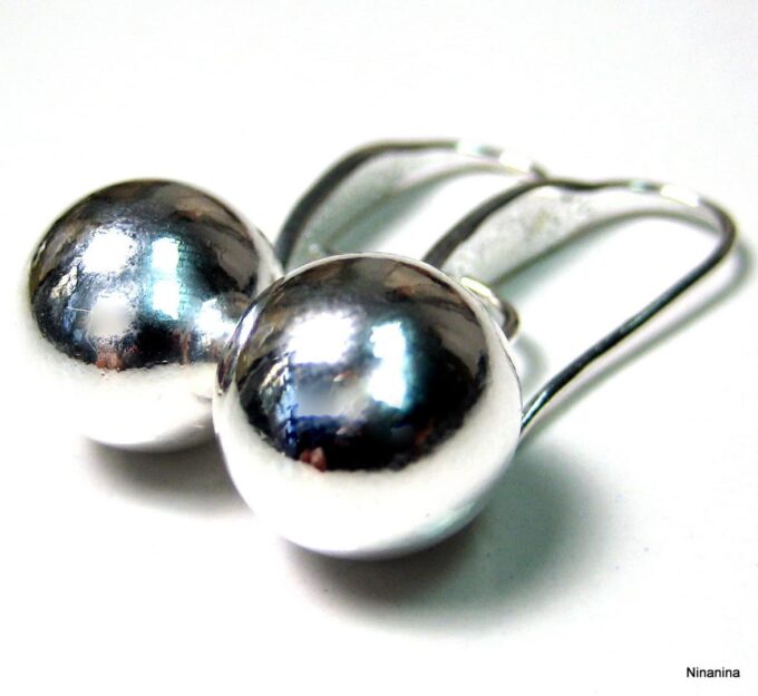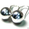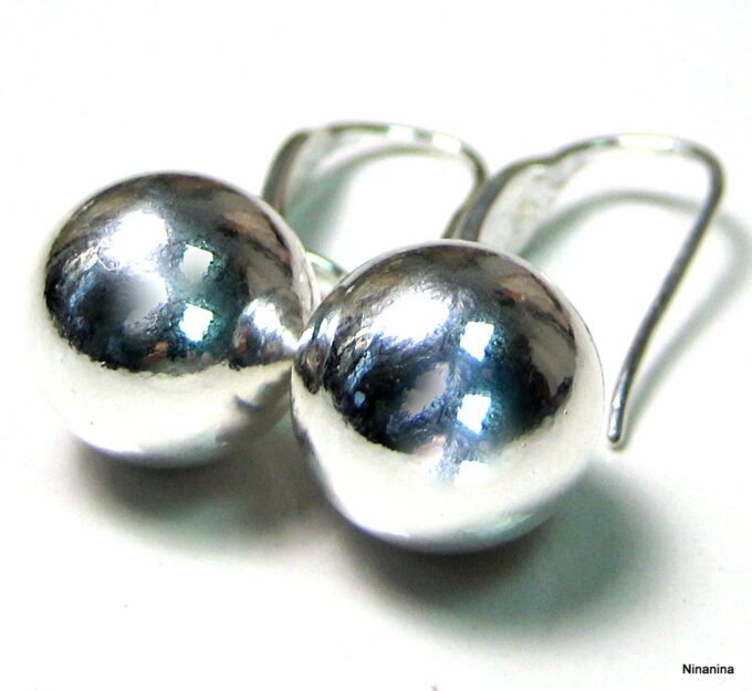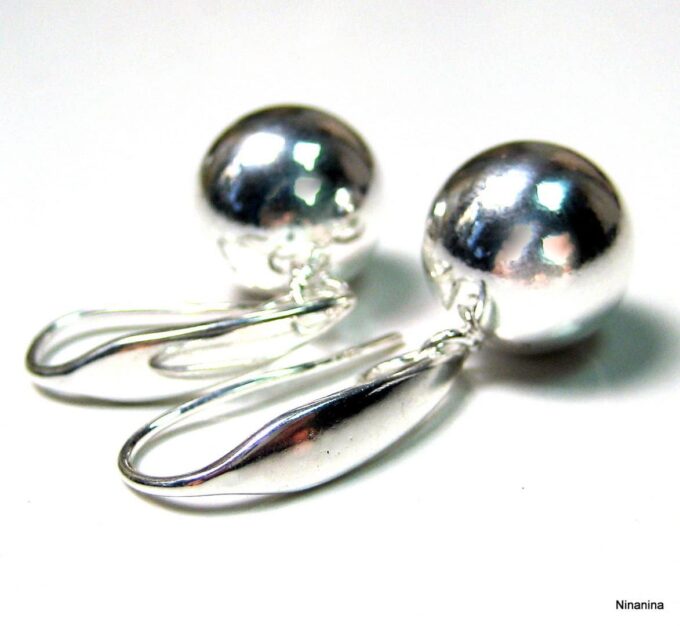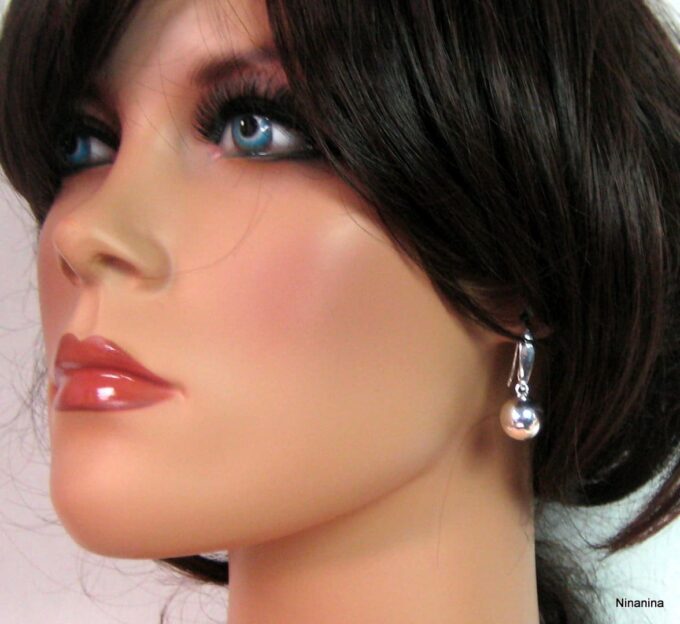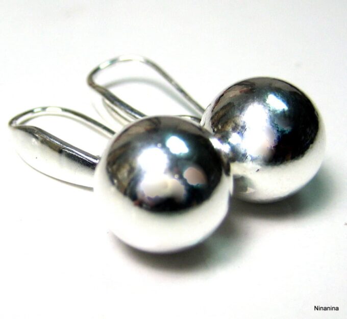 Boucles D’oreilles boules argent plaqué dormeuses composées de perles rondes en plaqué argent montées sur boucles dormeuses. Diamètre des perles : 1,2 cm. Longueur (boucle comprise) : 2,8 cm environ. Livré dans sa pochette d’organza. Poids : 3,4 g