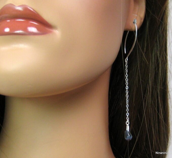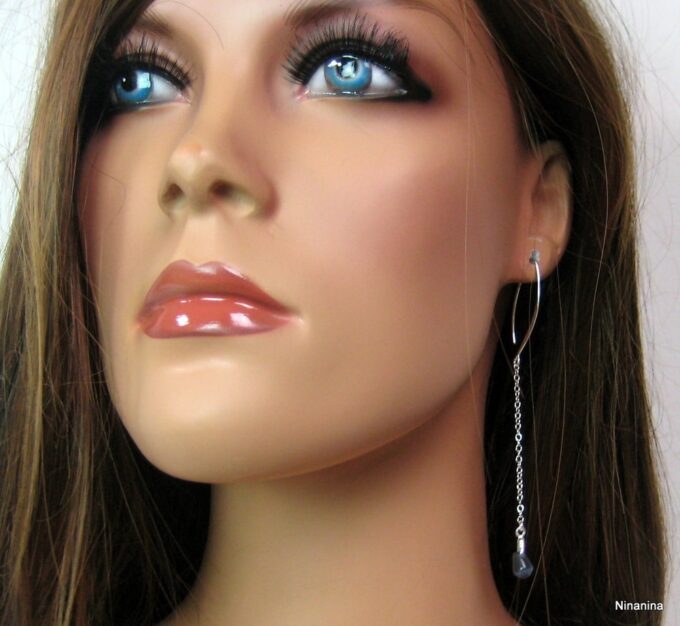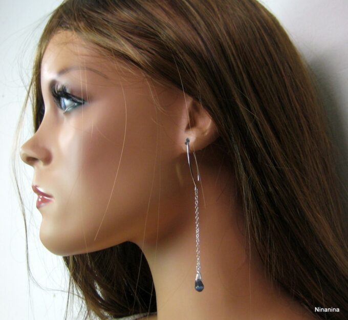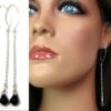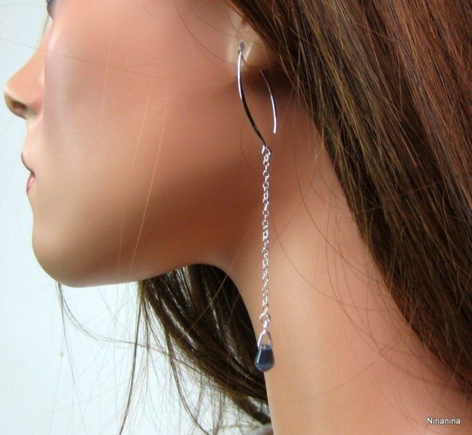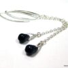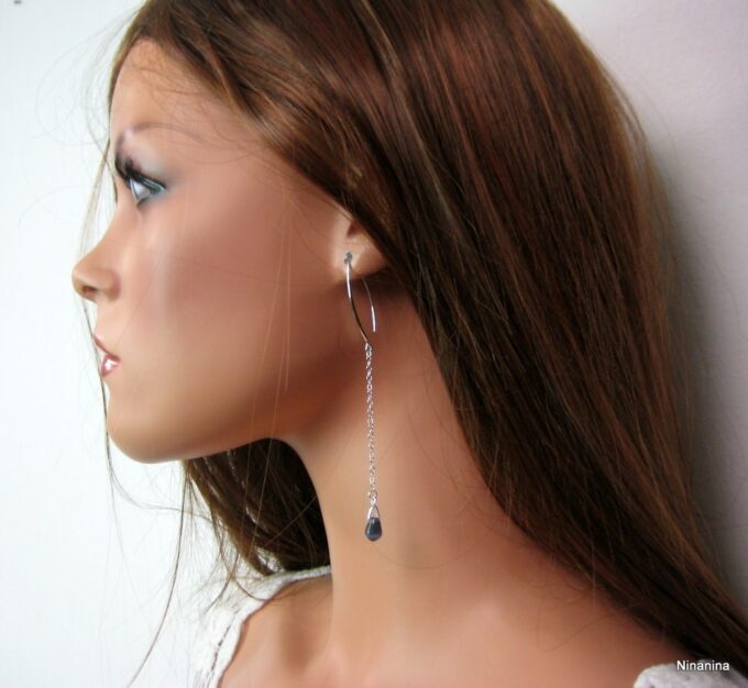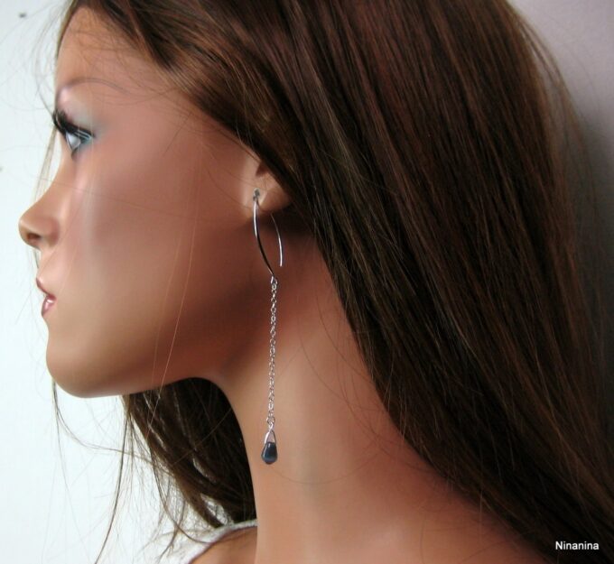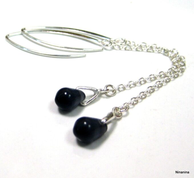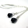 Boucles pendantes argent 925 massif perles noires composées de perles de verre ovales noires montées sur chainette et crochets d oreilles en argent 925.