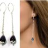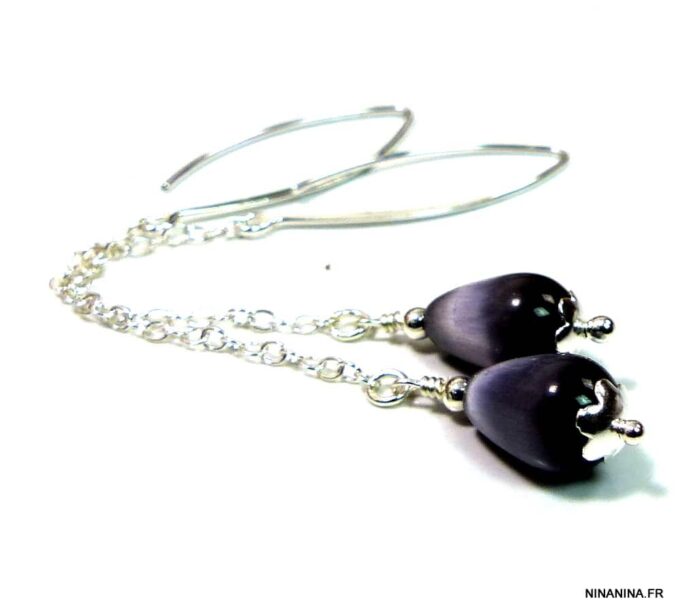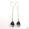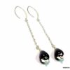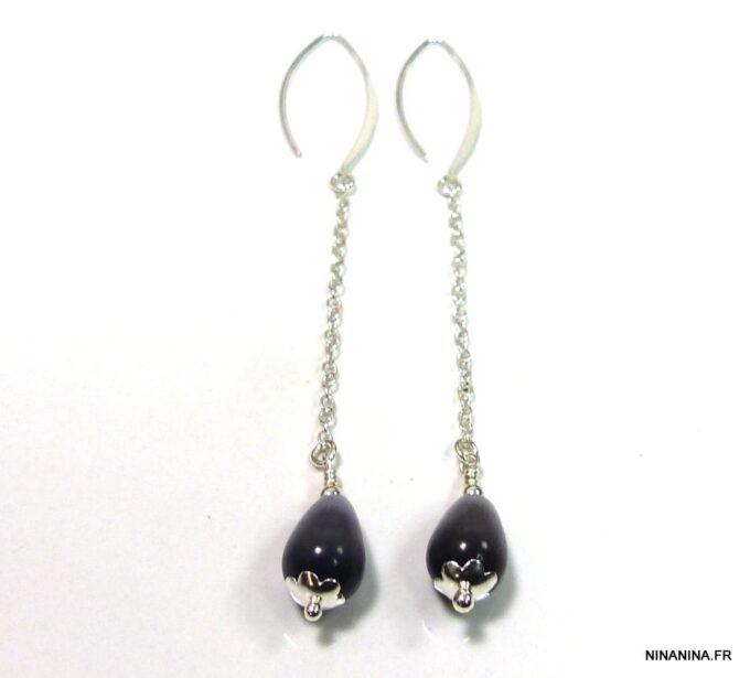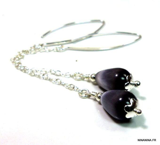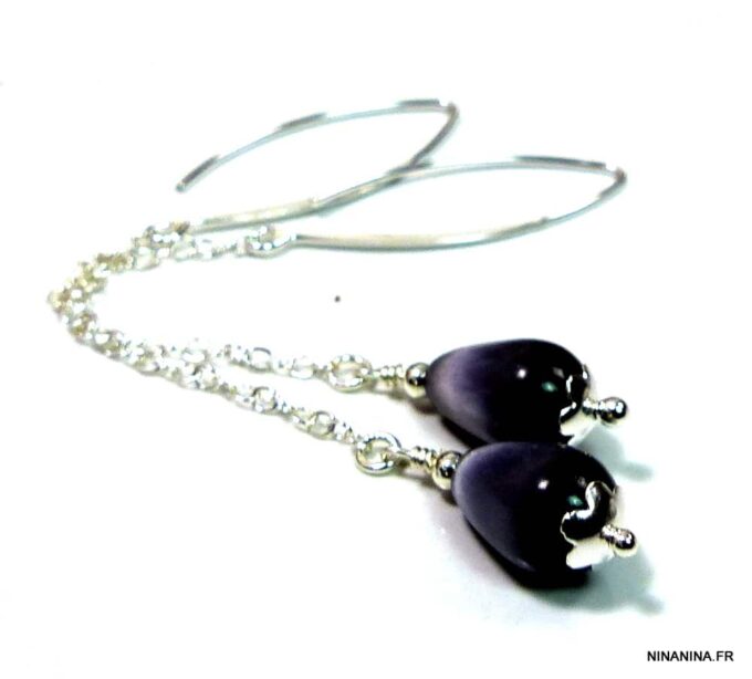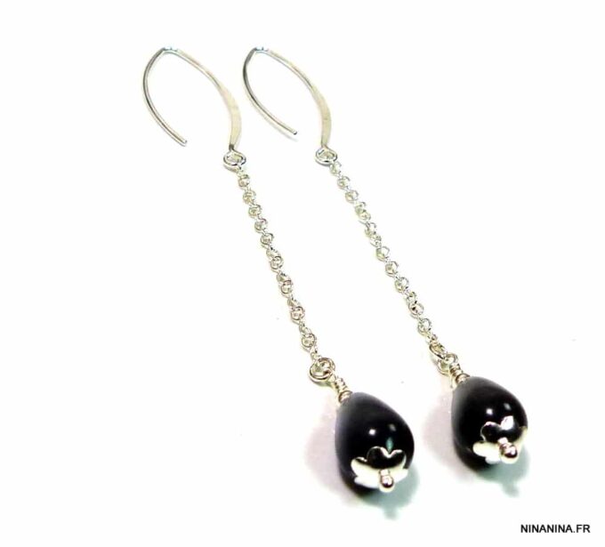 Boucles créoles argent massif gouttes noires composées de gouttes de verre noires montées sur chainette et boucles créoles en argent 925. Dim des gouttes : 1,2 X 1,4 cm. Longueur (boucle comprise) : 10 cm environ. Livré dans sa pochette d’organza. Livré dans sa pochette d’organza. Bijou 100% fait main. Poids : 1,5 g
