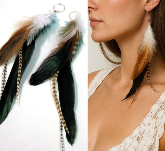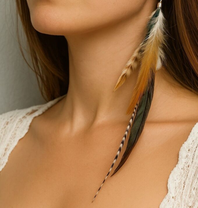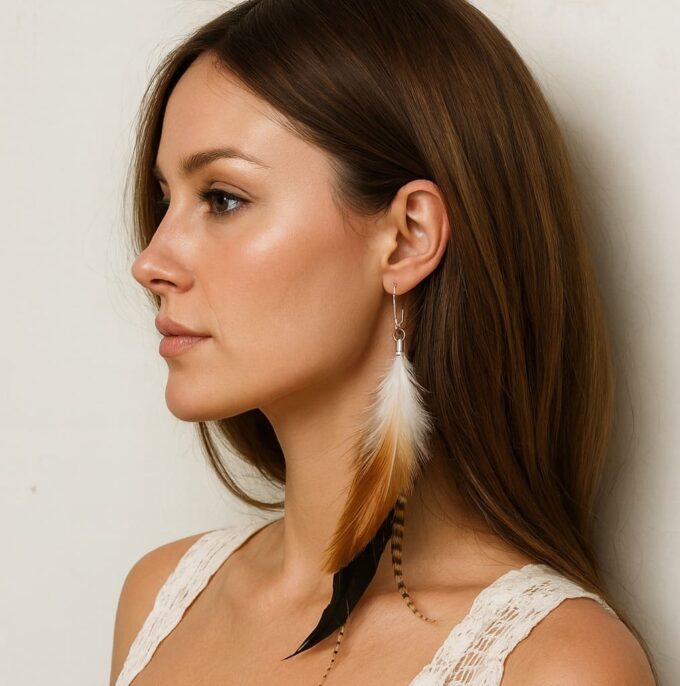 Des boucles d’oreilles plumes peuvent être portées avec des cheveux courts ou relevés. En effet, les boucles d’oreilles longues avec plume ou sans plume seront plus facilement mises en valeur sur un cou dégagé. Elles pourront affiner le visage en lui apportant un encadrement dans la longueur.