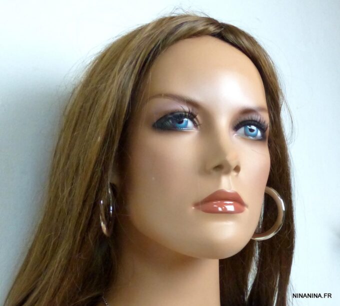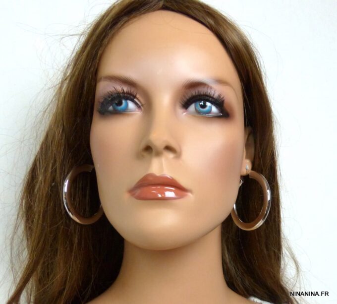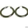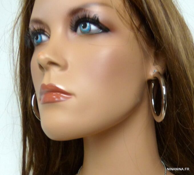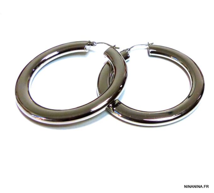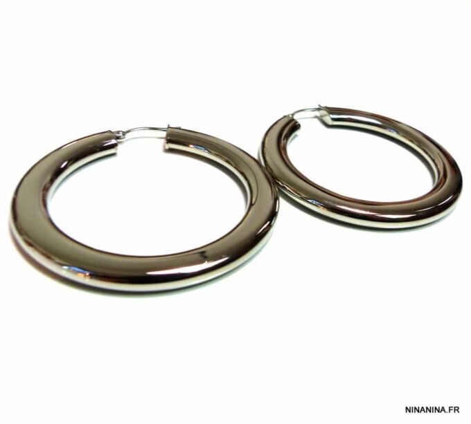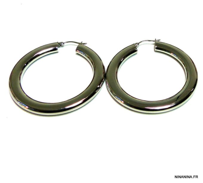 Boucles créoles en acier inoxydable. Diamètre des pendentifs: 5,5 cm. Largeur : 0,6 cm. Longueur (boucle comprise) : 5,5 cm environ. Livrées dans sa pochette d’organza. Poids : 8,6 g