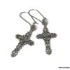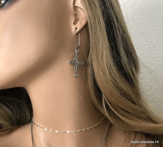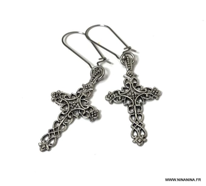 Boucles d oreilles croix pendantes métal argent composées de grandes croix ciselées en métal argenté montées sur boucles ovales en acier inoxydable