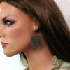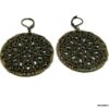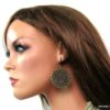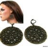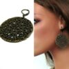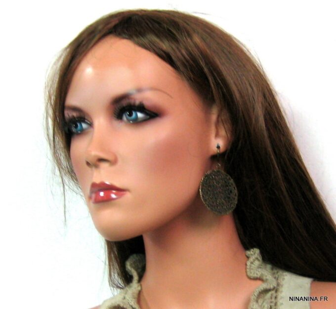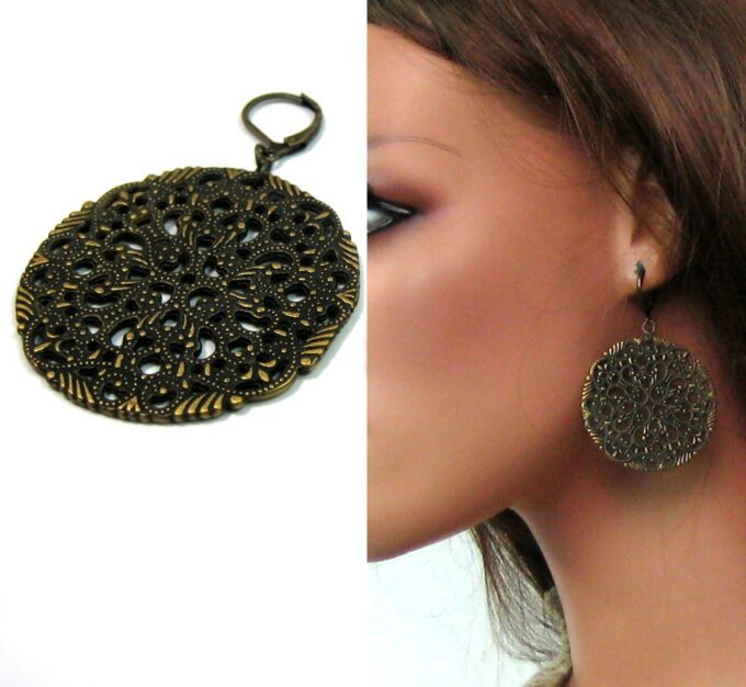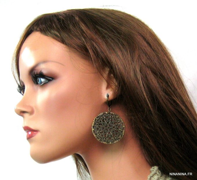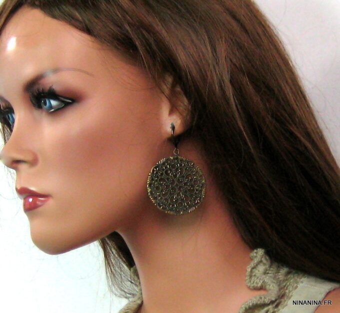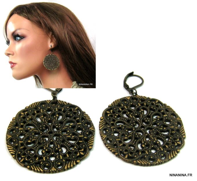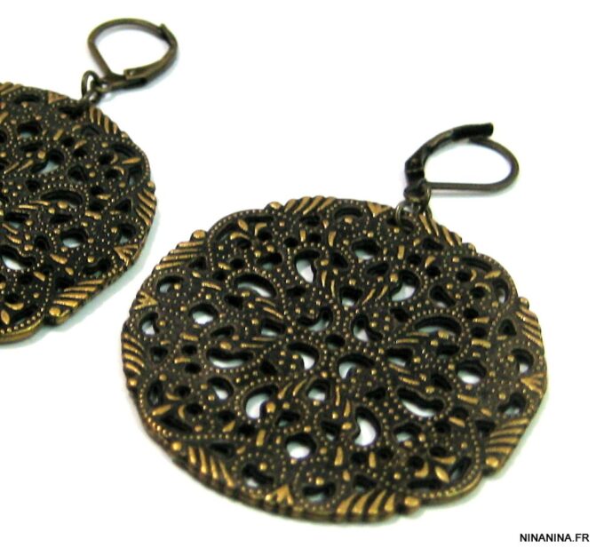 Boucles d’oreilles métal bronze pendentif rond filigrané composées de pendentifs ronds filigranés en métal bronze montés sur boucles dormeuses. Diamètre des pendentifs : 4,1 cm. Longueur (boucle comprise) : 6 cm environ. Livré dans sa pochette d’organza. Bijou 100% fait-main.