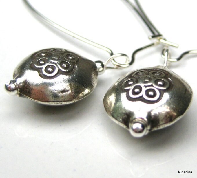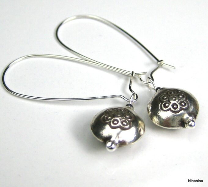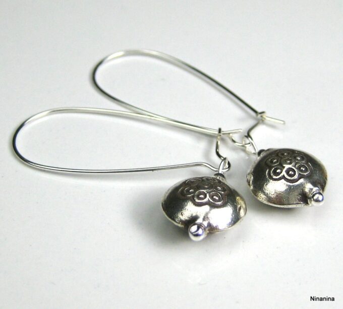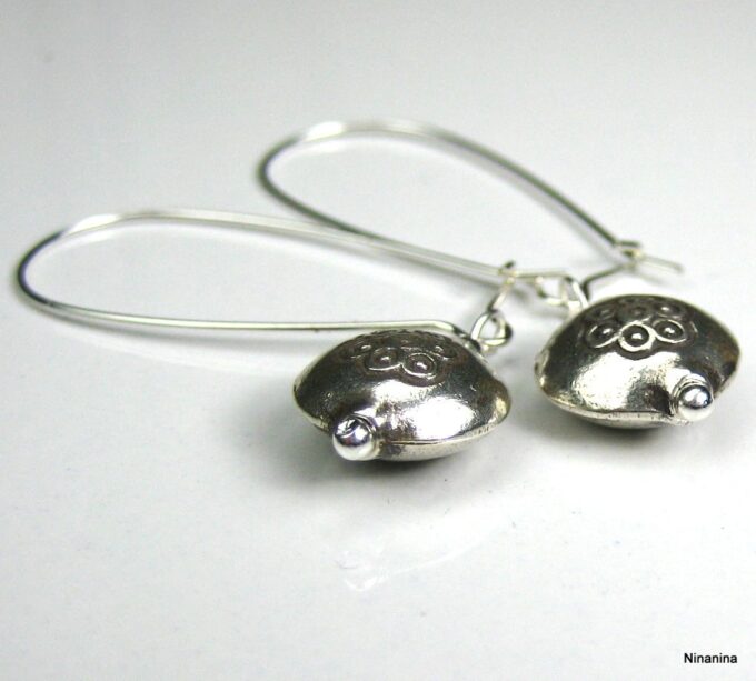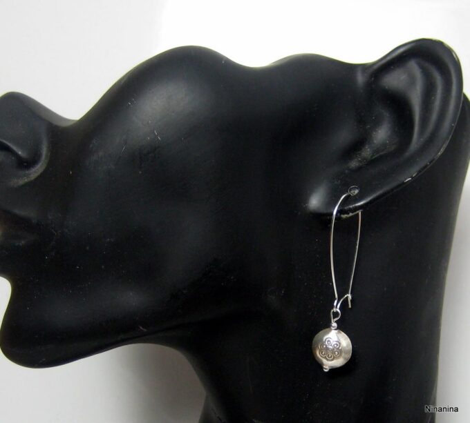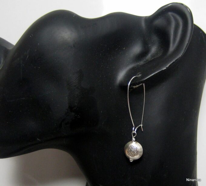 Boucles créoles ovales argent massif composées d’une perle ronde plate ciselée et de deux petites perles rondes en argent 925 montées sur boucles créoles en argent 925. Dim de la perle : 1 X 0,6 cm. Longueur (boucle comprise) : 5 cm. Livré dans sa pochette d’organza. Poids : 2,1 g