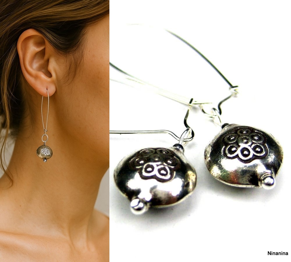 Ces boucles d’oreilles pendantes en argent massif sont finement travaillées à la main.