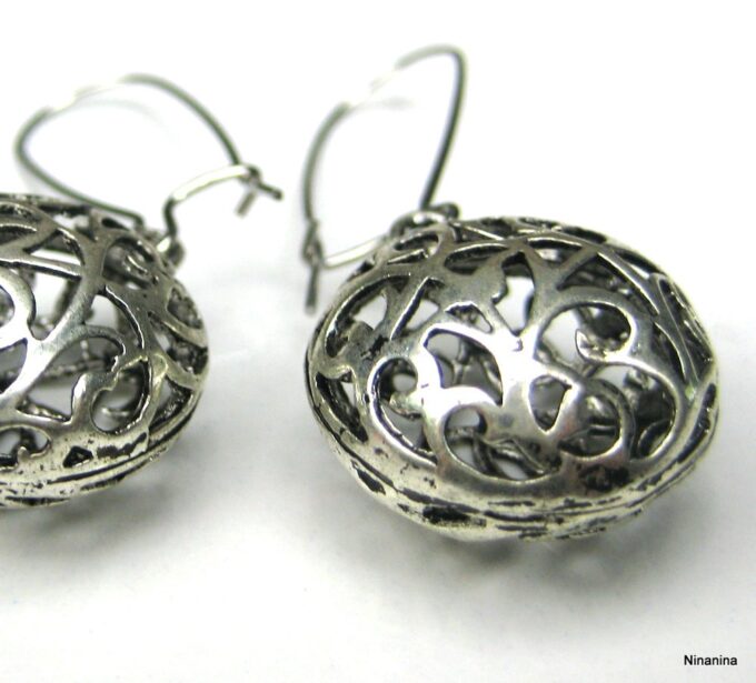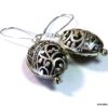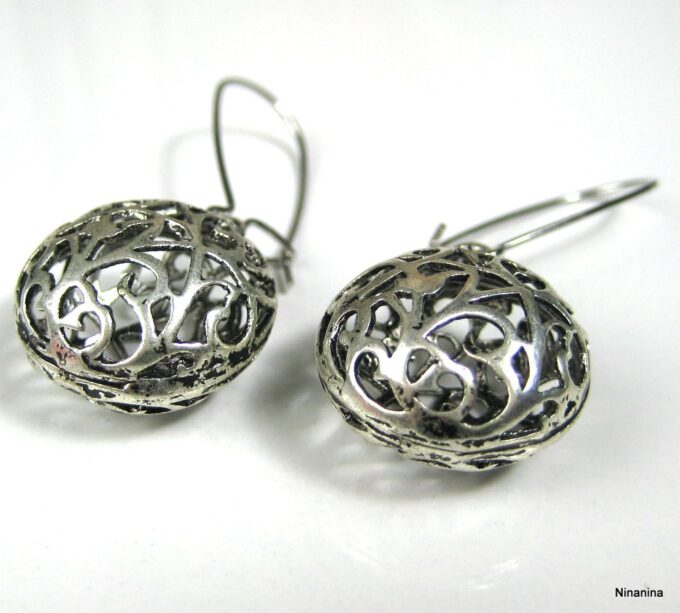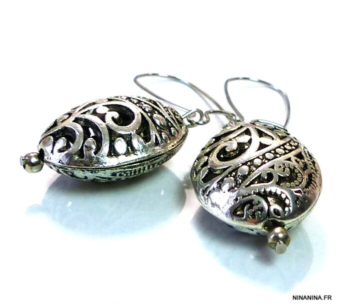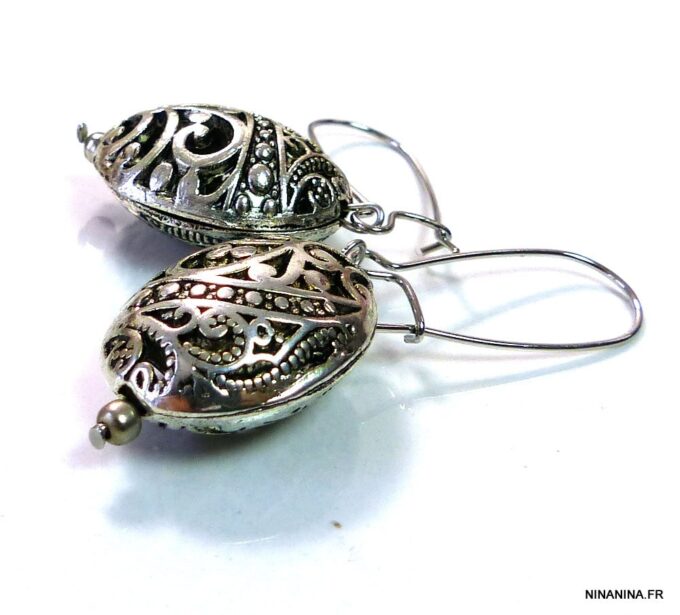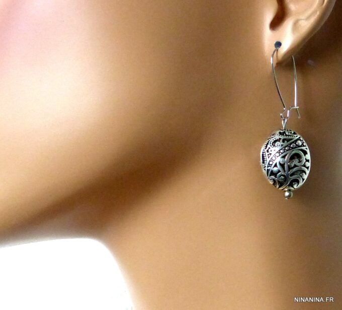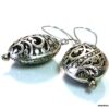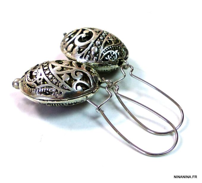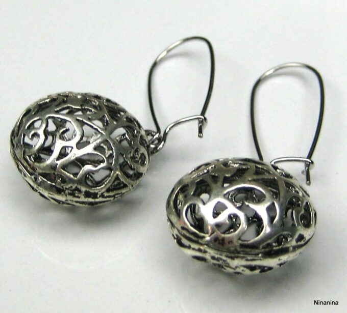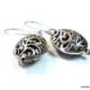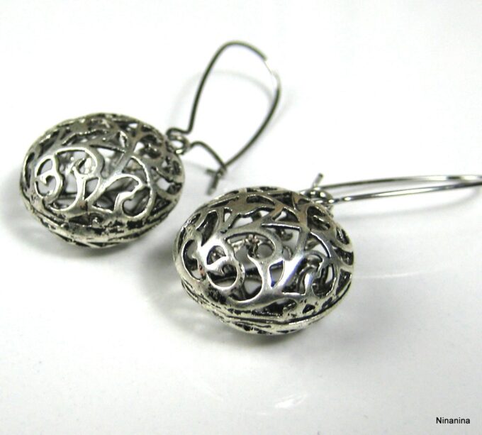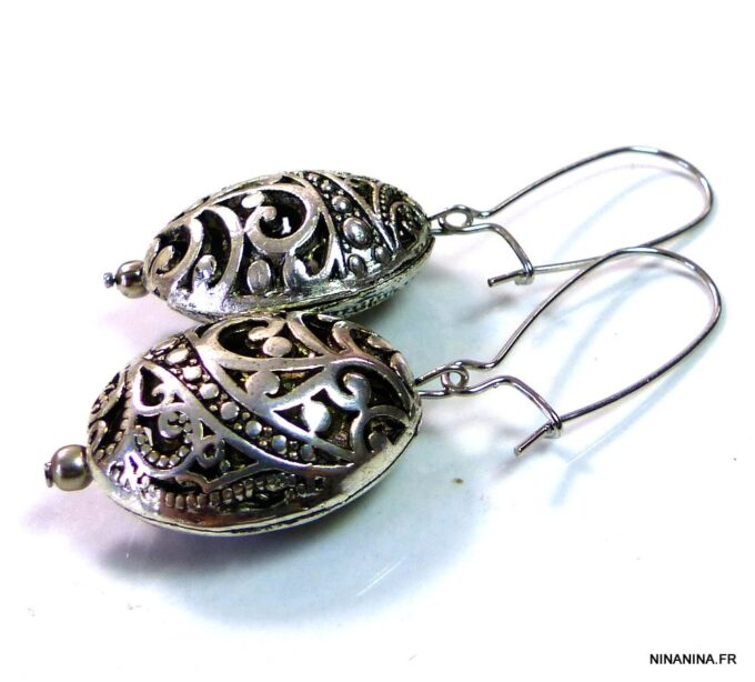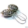 Boucles D’oreilles ovales pendentifs filigranés composées de pendentifs ovales filigranés en métal argenté montés sur boucles pendantes ovales en métal argenté.