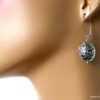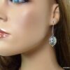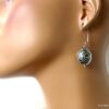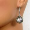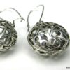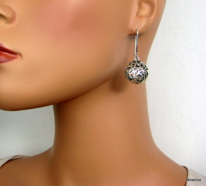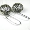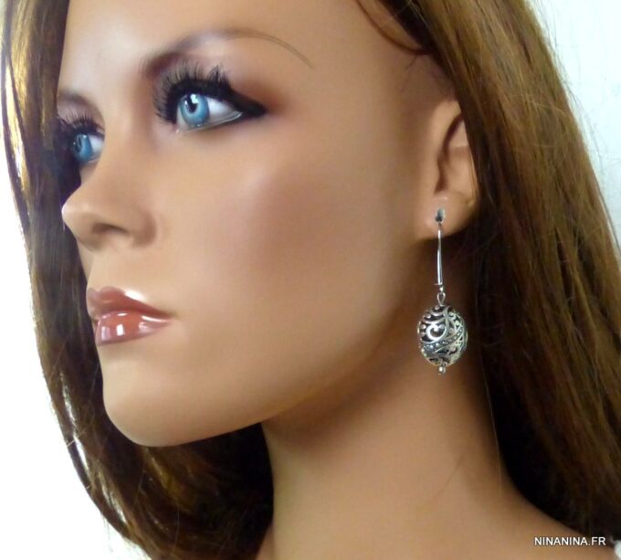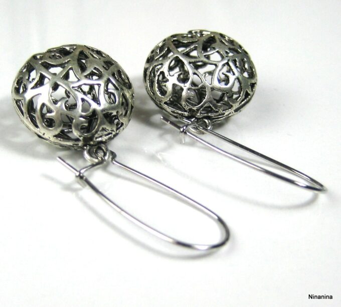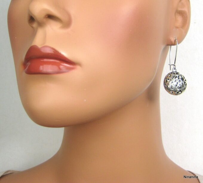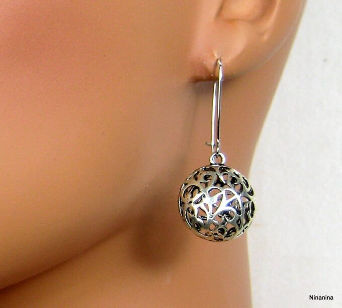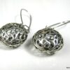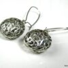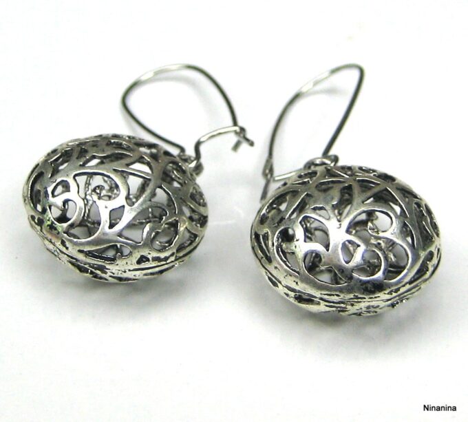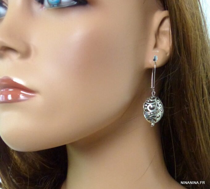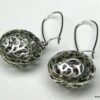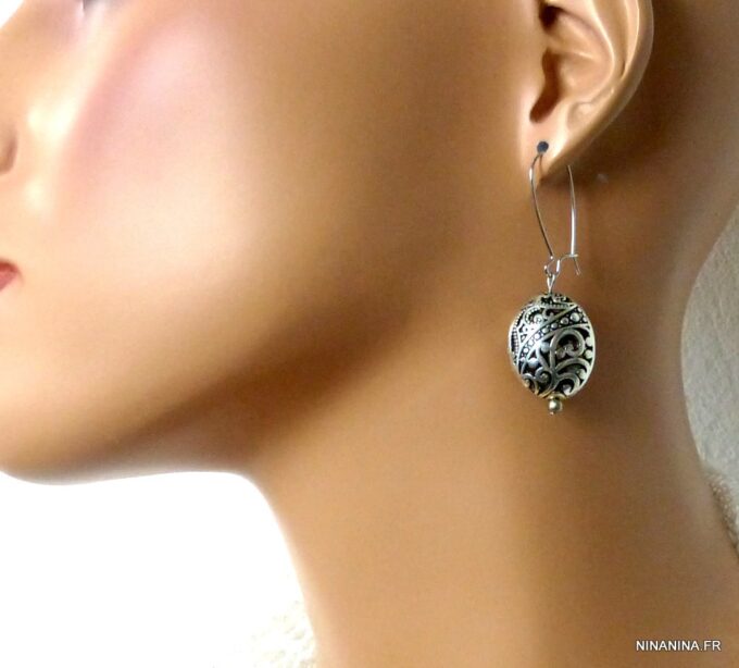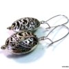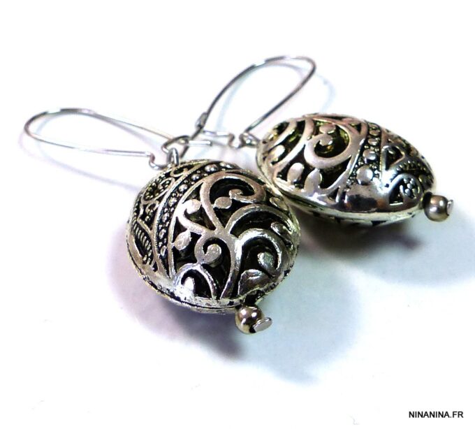 Boucles D’oreilles ovales pendentifs filigranés composées de pendentifs ovales filigranés en métal argenté montés sur boucles pendantes ovales en métal argenté.