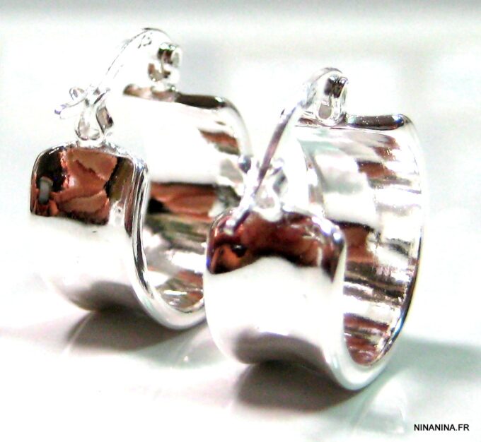 Boucles créoles créoles larges plaqué argent rondes aux rebords courbés en plaqué argent. Dim de la boucle : 1,6 X 1,8 cm. Largeur : 0,8 cm. Livré dans sa pochette d’organza.