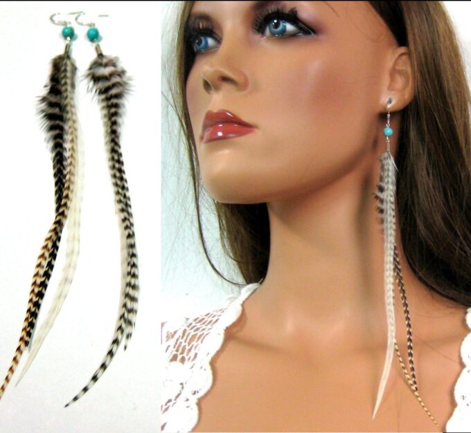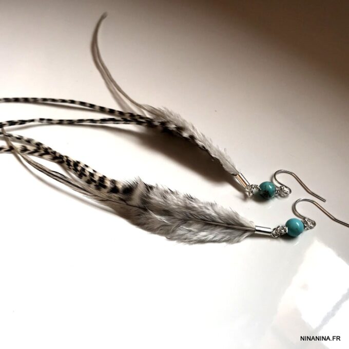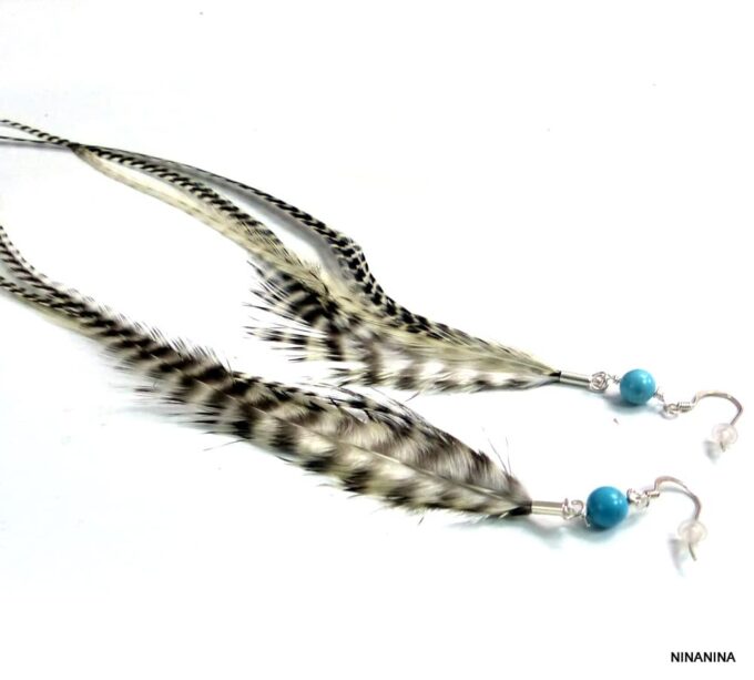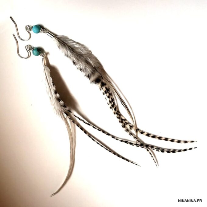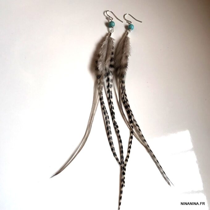 Craquez pour cette paire de Boucles d’oreilles plumes Argent massif boheme chic de style boheme chic ! Elles sont composées de longues plumes blanches et noires et de turquoises rondes et de perles rondes en turquoise de 6mm montées sur boucles pendantes en argent 925. Cette paire de Boucles d’ Oreille de haute qualité est unique et fabriquée à la main, de façon artisanale dans notre atelier en France.