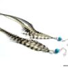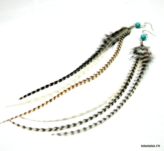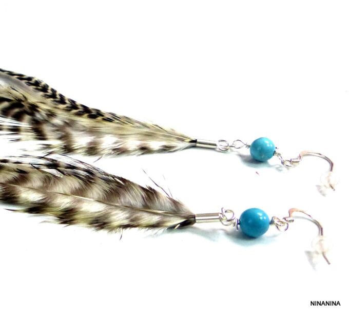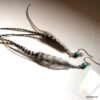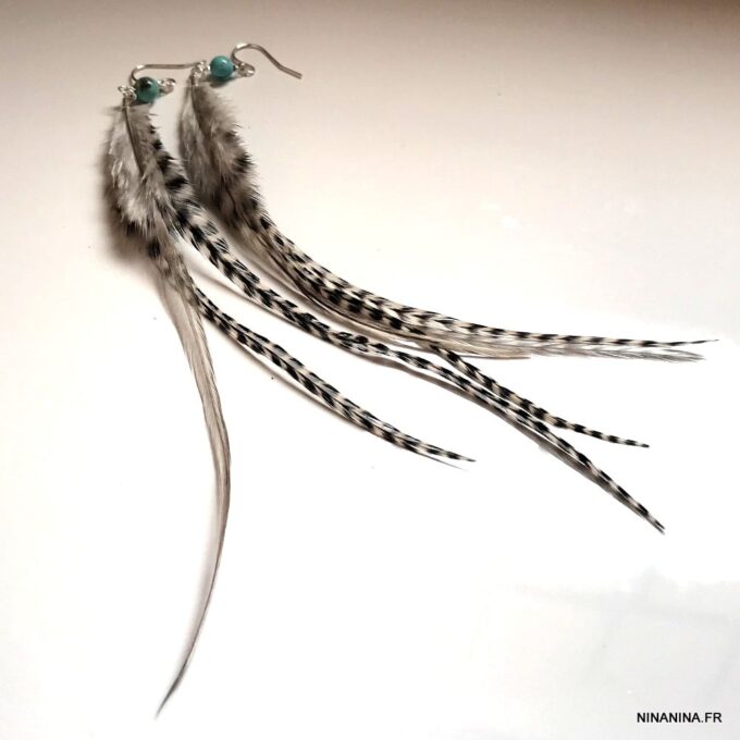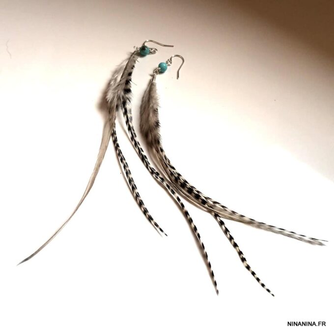 Les Boucles d’Oreilles sont fabriquées à la main avec des plumes naturelles de grande qualité, de façon artisanale dans notre atelier en France. Elles mesurent 25 cm de long environ. Les pierres en turquoise ont un diamètre de 6mm. Les plumes étant naturelles, elles peuvent varier légèrement d’un modèle à l’autre c’est ce qui fait le charme du travail artisanal et de la pièce unique.