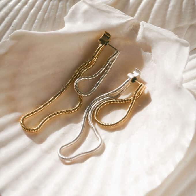 Ces boucles d’oreilles chaînées en maille serpent sont idéales pour structurer et allonger visuellement le visage. Grâce à leur forme élancée et leur brillance dorée, elles se marient parfaitement avec des coiffures relevées comme un chignon bas, une queue de cheval haute ou une tresse floue, pour laisser la boucle s’exprimer pleinement.