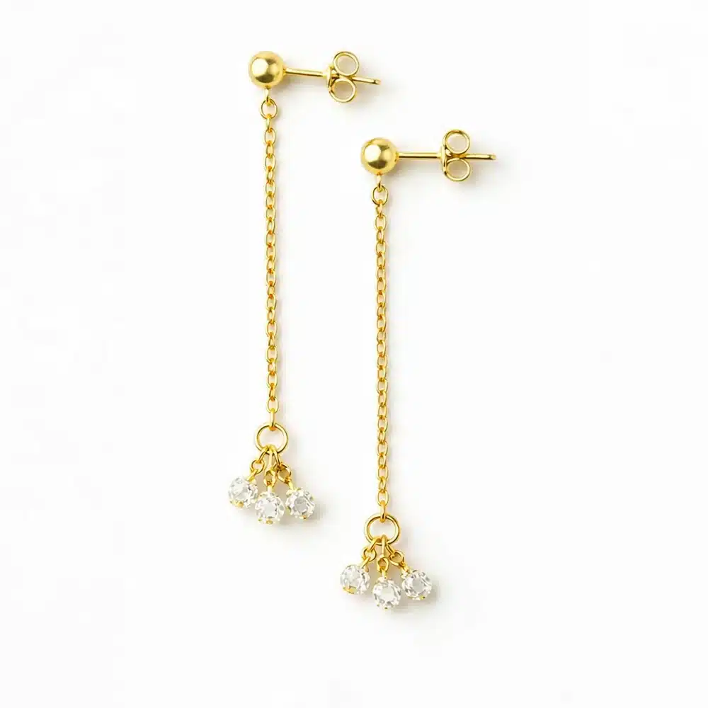 Réalisées en plaqué or de qualité, ces boucles d’oreilles pendantes allient la chaleur de l’or à la finesse du diamant. Leur fabrication faite main en France garantit un travail minutieux, des finitions soignées et un bijou conçu pour durer. Légères et confortables, elles sont parfaitement adaptées à un port quotidien comme aux occasions plus habillées.