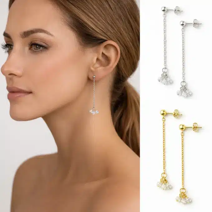 À l’extrémité de chaque chaîne, plusieurs diamants blancs véritables sont délicatement suspendus en grappe. Leur éclat naturel capte la lumière avec finesse, offrant une brillance élégante sans excès. Chaque diamant étant authentique, de légères variations rendent chaque paire unique et précieuse.
