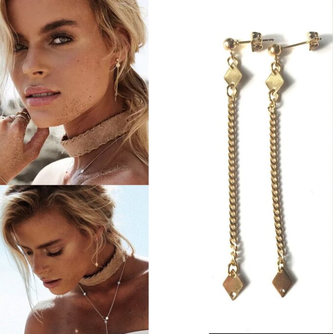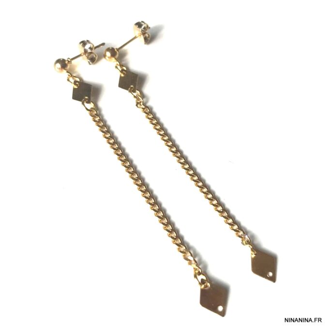 Des boucles d’oreilles très longues ces Boucles d’oreilles chaine pendantes Acier inox doré composées de losanges en acier inoxydable doré montés sur une boucle clou.