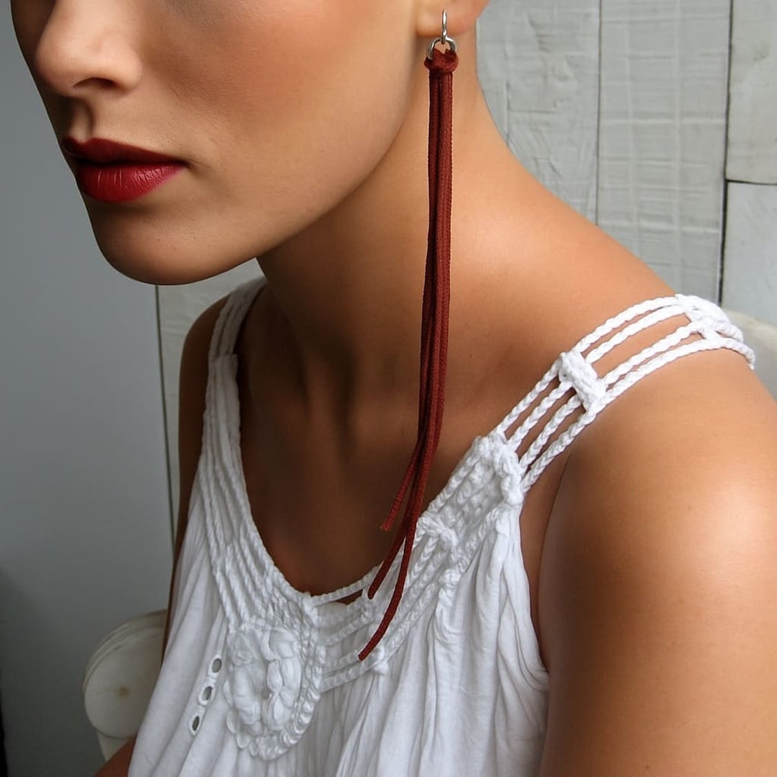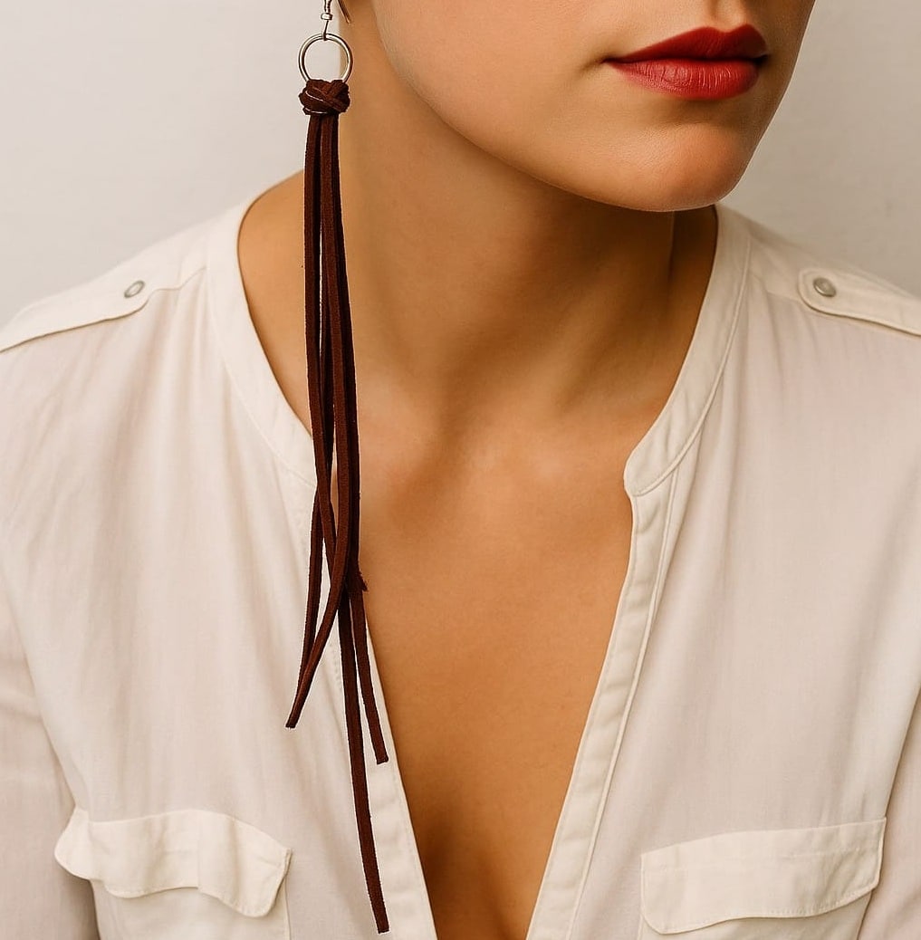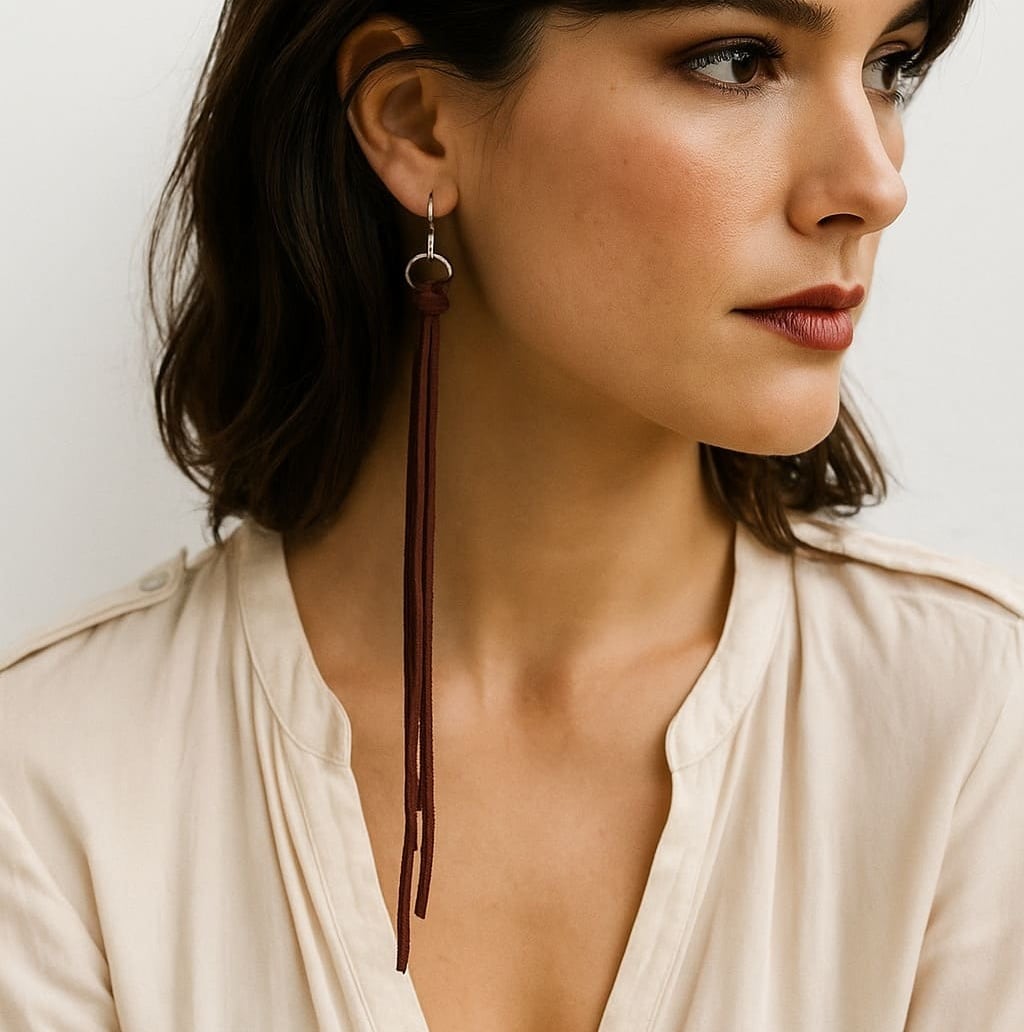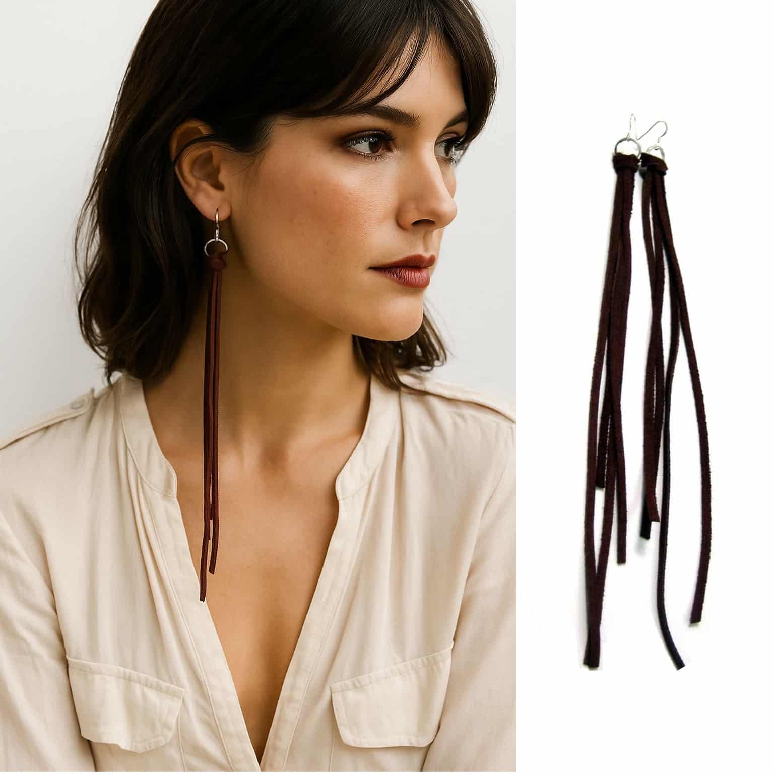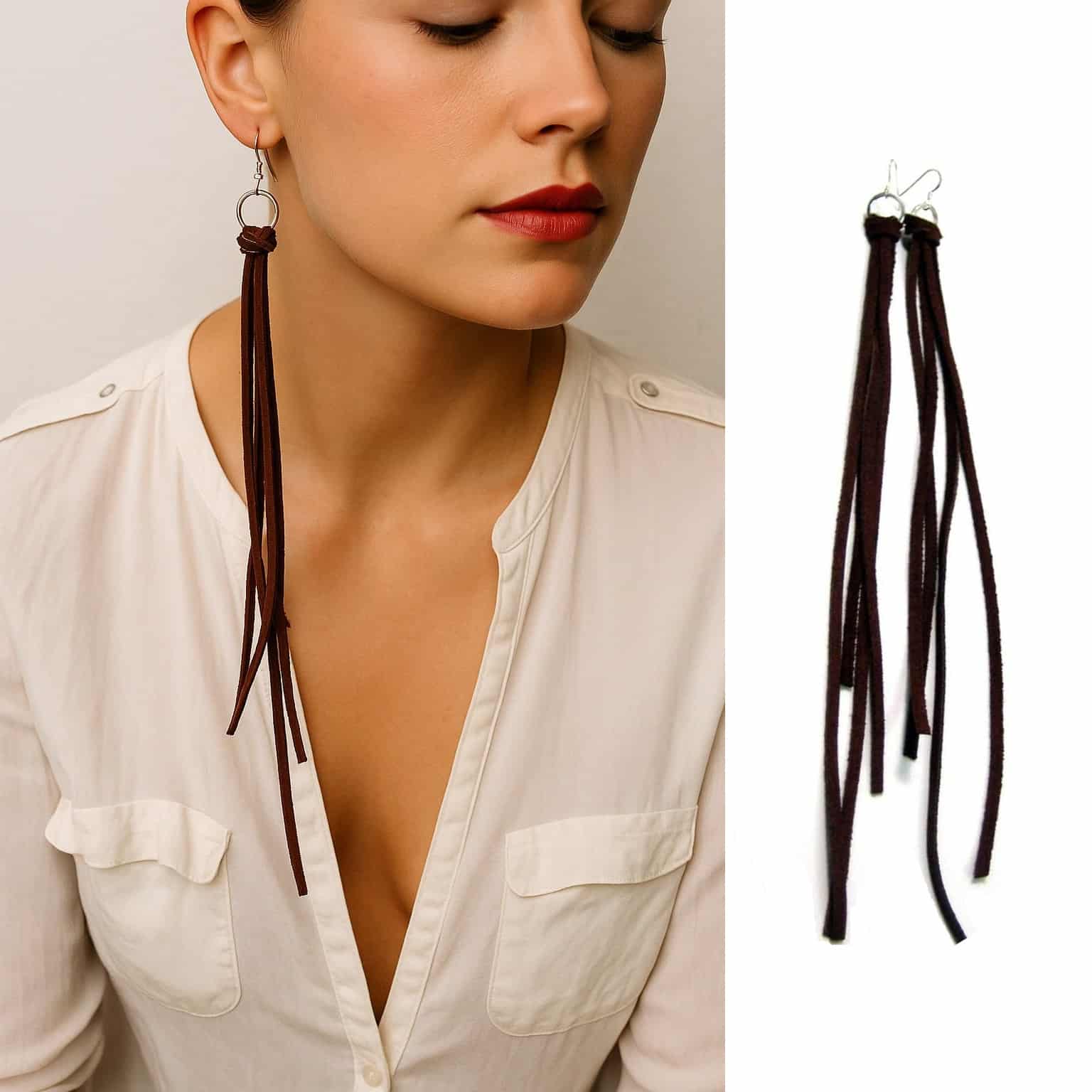 Boucles d’oreilles cordon daim et argent massif composées d’un double lacet de daim marron chocolat monté sur un anneau ronds en argent 925 et boucle pendant en argent 925. Longueur totale (boucle comprise): 24 cm env. Livré dans sa pochette d’organza. Bijou 100% fait-main. Poids : 3 g