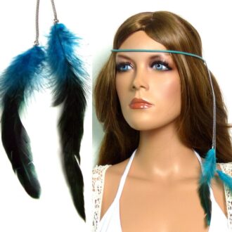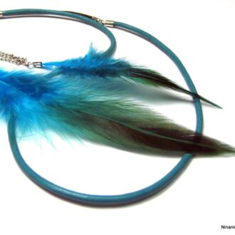 Boucles d’oreilles plumes turquoises dormeuses composées de plumes vert/turquoises montées sur une estampe filigranée ronde en métal argenté et boucle dormeuse.