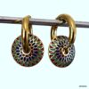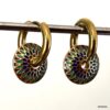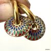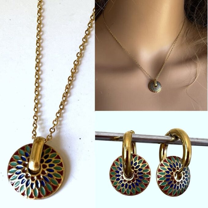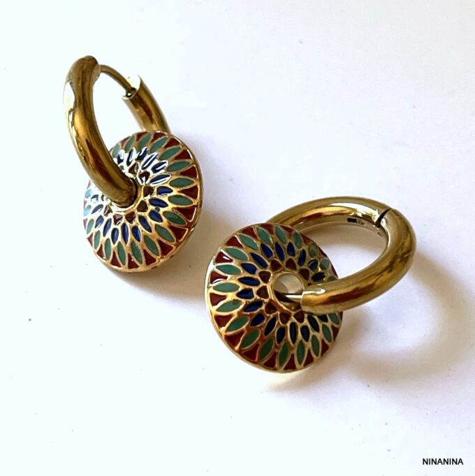 Chaque disque présente un motif émaillé finement travaillé en forme de pétales, évoquant une fleur stylisée ou un vitrail. Les couleurs vibrantes sont subtilement mises en valeur par le doré, pour un rendu à la fois bohème et élégant.