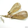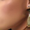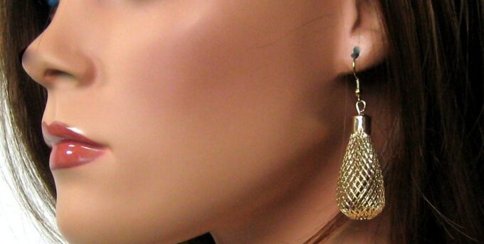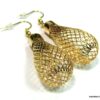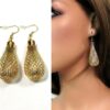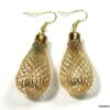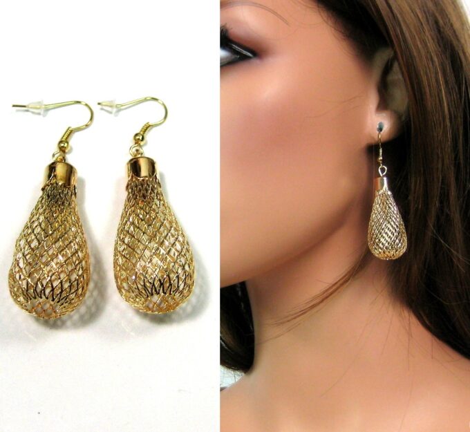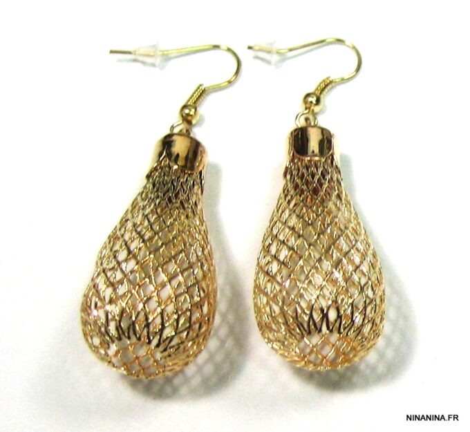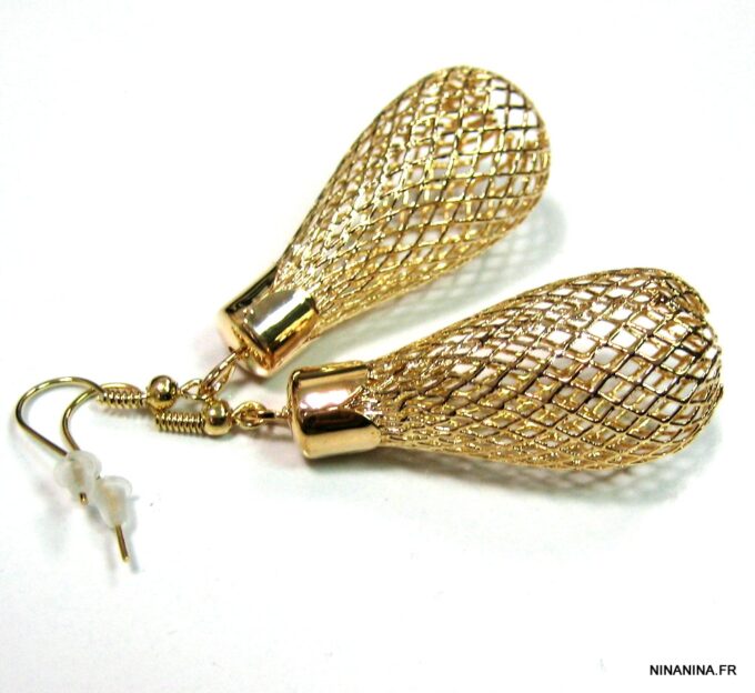 Boucles d’oreilles gouttes métal doré composé de gouttes en résille de métal doré montées sur boucle pendante. Dim des pendentifs : 4,5 X 1,8 cm. Hauteur (boucle comprise) : 6,5 cm environ. Embouts stoppeurs en silicone fournis. Livré dans sa pochette d’organza. Bijou 100% fait-main.