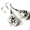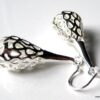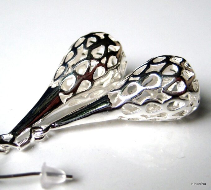 Ces boucles d’oreilles pendantes artisanales arborent une forme de goutte allongée, finement ajourée dans un motif filigrané inspiré de la nature.