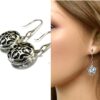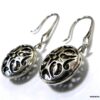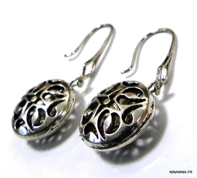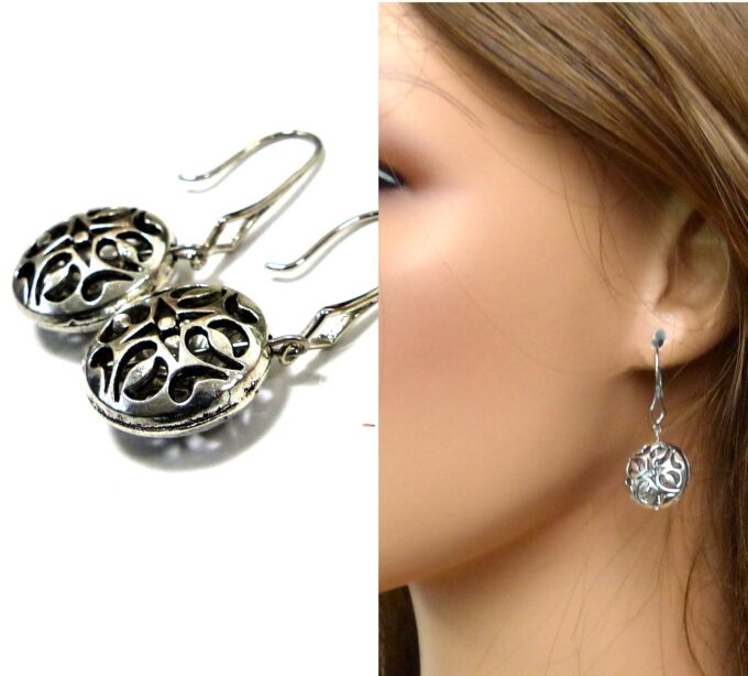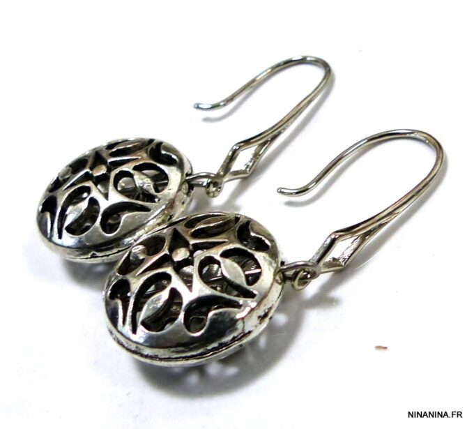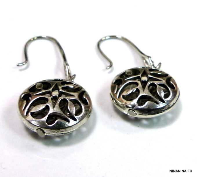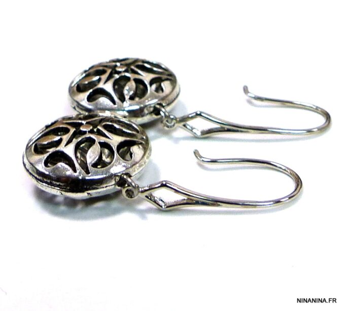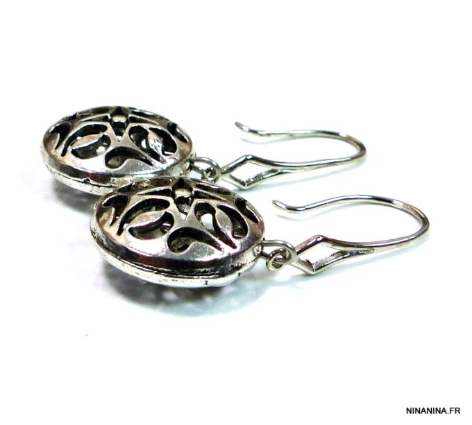 Boucles d’oreilles fantaisie pendentifs ronds argentés composées de pendentifs ronds bombés filigranés en métal argenté montés sur boucles crochet ovales en métal argenté. Dim du pendentif : 1,6 X 1,6 cm Longueur (boucle comprise) : 4,2 cm environ. Livrées dans sa pochette d’organza.