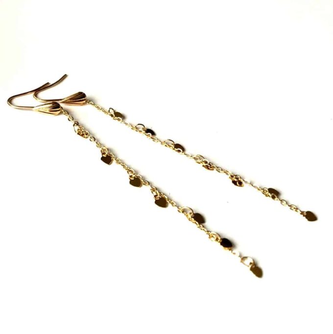 Les breloques cœur sont disposées à intervalles réguliers le long des chaînes, créant un effet visuel harmonieux. Les boucles d’oreilles sont suspendues à des crochets au motif fantaisie, assurant un port confortable et sécurisé. Le design global est élégant et féminin, adapté à diverses occasions. Les cœurs sont polis et reflètent la lumière, indiquant une surface lisse.