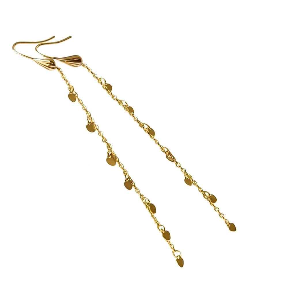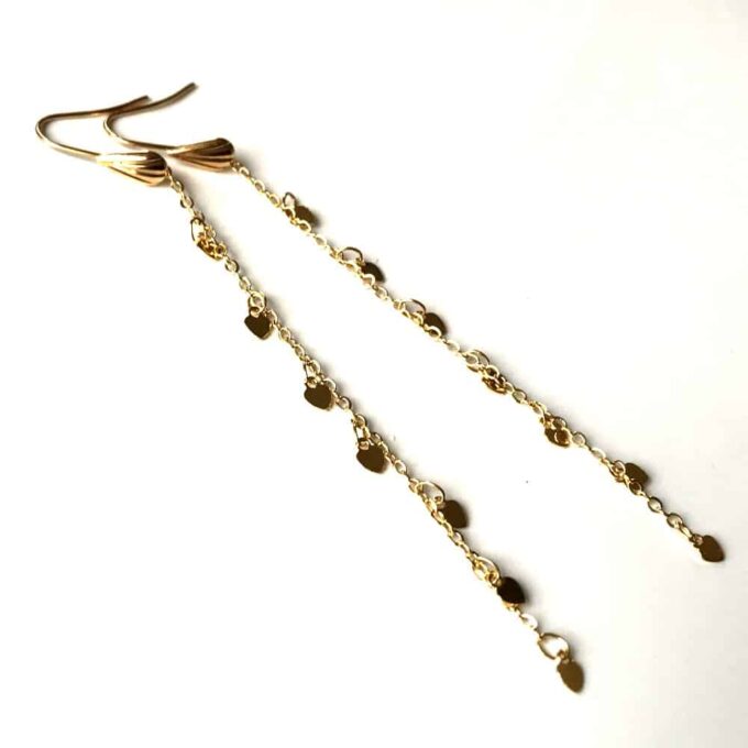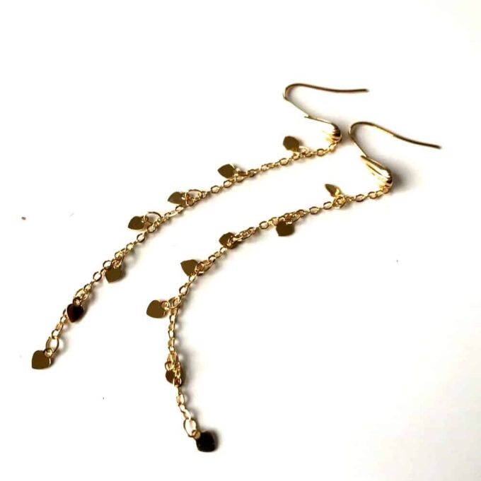 Ces boucles d’oreilles en plaqué or 14 carats gold filled sont délicatement conçues avec des chaînes fines et élégantes, ornées de petits cœurs qui ajoutent une touche romantique et féminine.