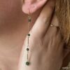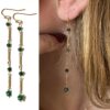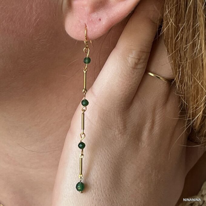 Découvrez nos Boucles d’oreilles pendantes en laiton doré et perles vertes. Ces boucles d’oreilles pendantes sont composées d’une succession de petites tiges dorées reliées entre elles par de délicates perles vertes facettées, créant un effet de légèreté et de mouvement. Chaque boucle se termine par une perle verte suspendue, apportant une touche raffinée et sophistiquée. Elles sont dotées de crochets fins pour un port confortable et aérien, sublimant le visage avec élégance.