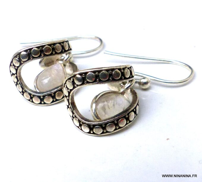 Boucle d’oreille pendante pierre de lune argent massif composée d’une goutte en pierre de lune naturelle et d’un pendentif ciselé en argent 925 montés sur boucles pendantes.