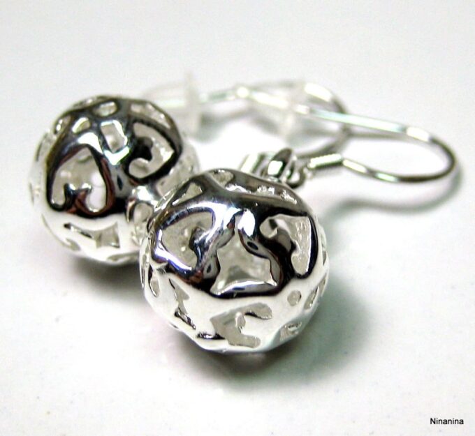 Boucles D’oreilles boules pendantes plaqué argent composées d’une perle ronde filigranée en plaqué argent montée sur boucles pendantes en plaqué argent. Diamètre de la perle : 1,3 cm env. Longueur (boucle comprise) : 3 cm environ. Livré dans sa pochette d’organza. Poids : 4,4 g