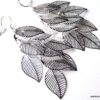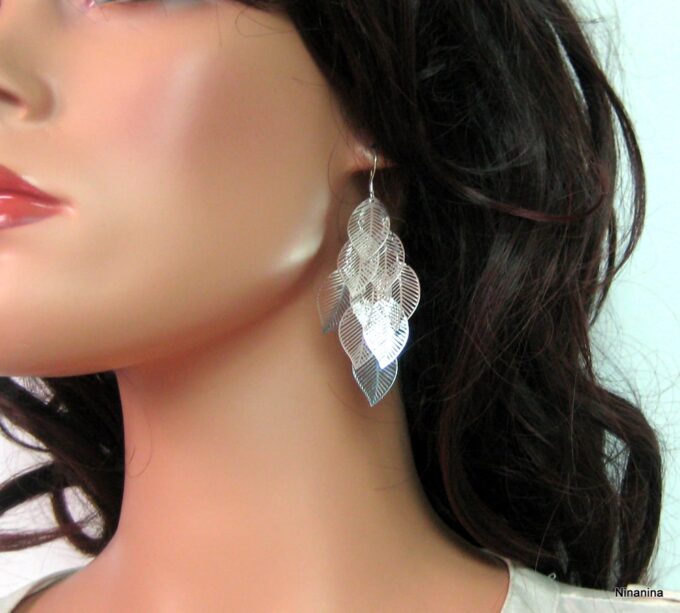 Boucles d’oreilles feuilles argent plaqué fines composées de feuilles très fines en plaqué argent montés sur boucles pendantes en plaqué argent. Dim des feuilles : 2,1 X 1,8 cm. Longueur (boucle comprise) : 8 cm environ. Livrées avec embouts stoppeur en silicone