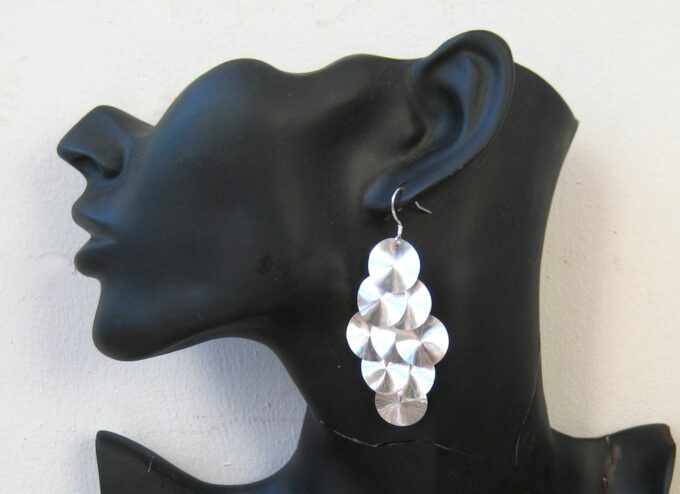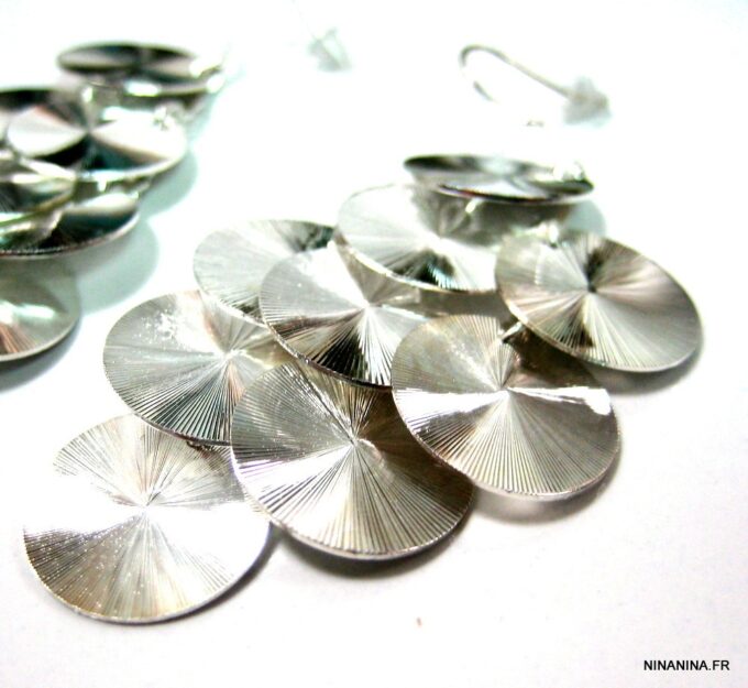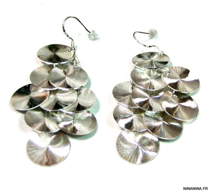 Boucles d’oreilles femme pendantes disques argent composées de disques en plaqué argent montés en quinconce sur boucles pendantes en plaqué argent.