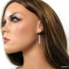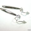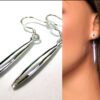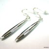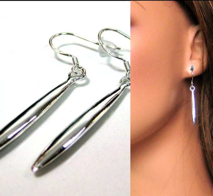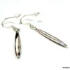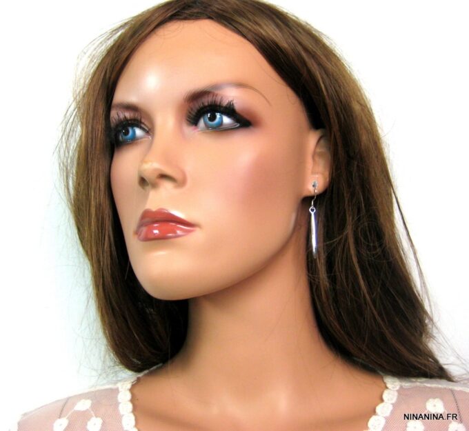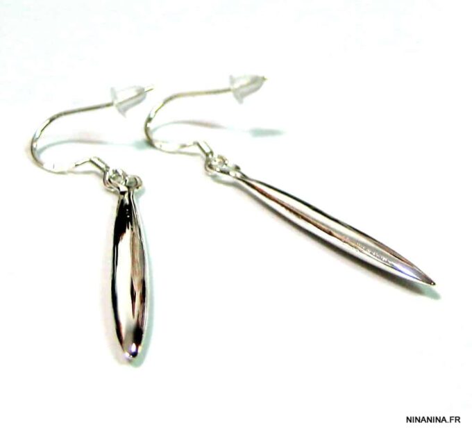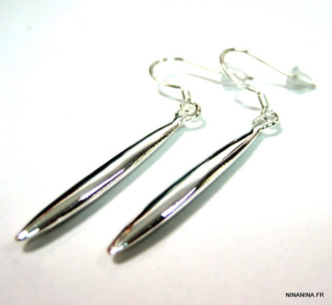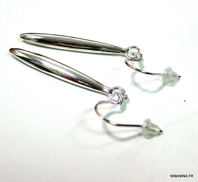 Boucles d’oreilles plaqué argent composées d’un pendentif oblong en plaqué argent monté sur boucles pendantes en plaqué argent. Dim du pendentif : 3,2 X 0,5 cm env. Longueur (boucle comprise) :4,5 cm environ. Livré dans sa pochette d’organza.