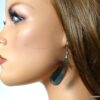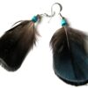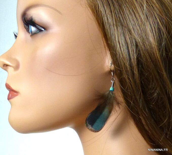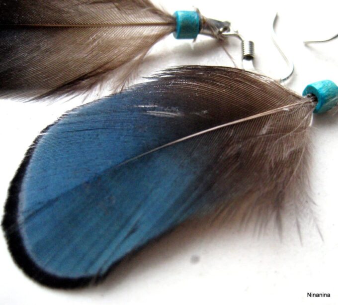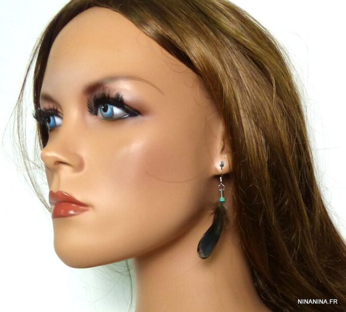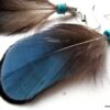 Boucles d’oreilles plumes bleu turquoise argent 925 composées de petites perles en bois cylindriques bleu turquoise et de plumes marrons bleutées montées sur boucles pendantes en métal argenté. Dim des plumes : 5 X 3 cm env. Longueur (boucle comprise) : 6 cm environ. Livrées dans sa pochette d’organza.