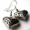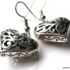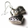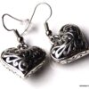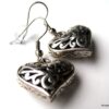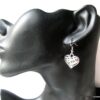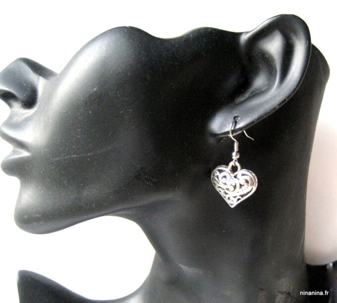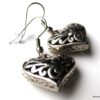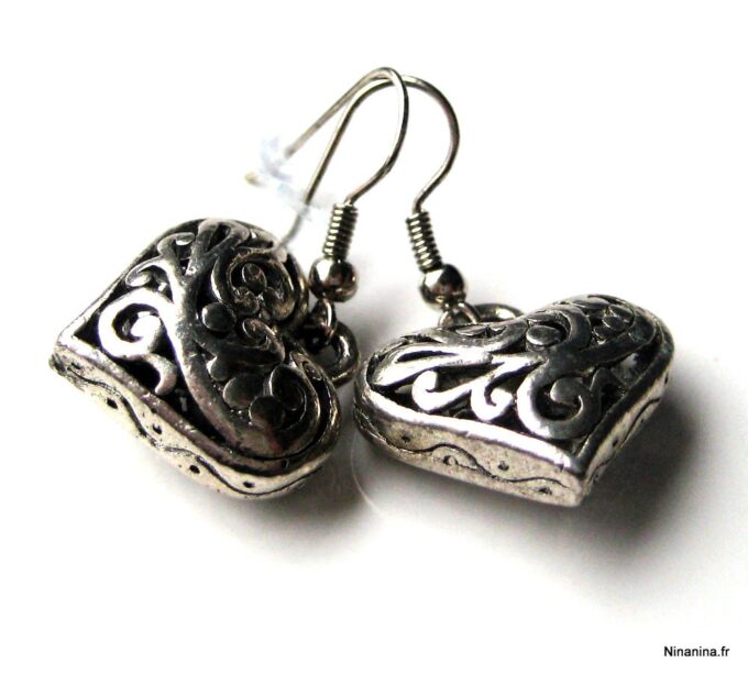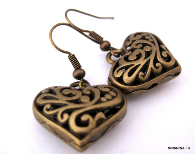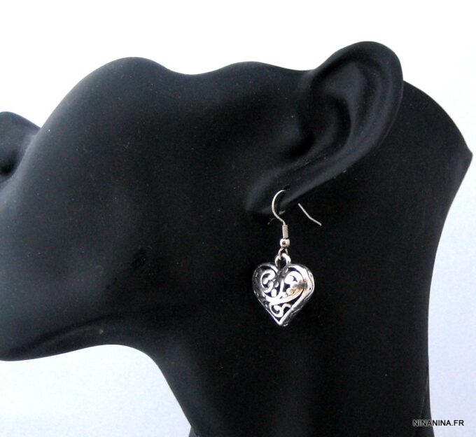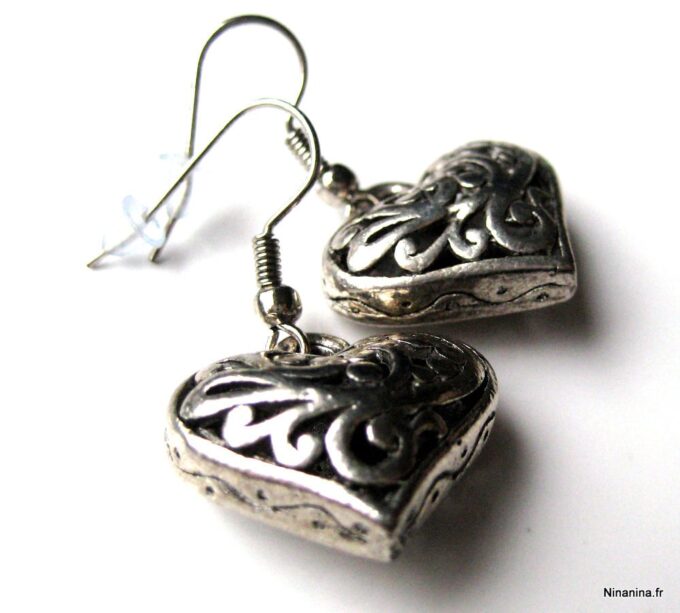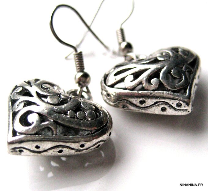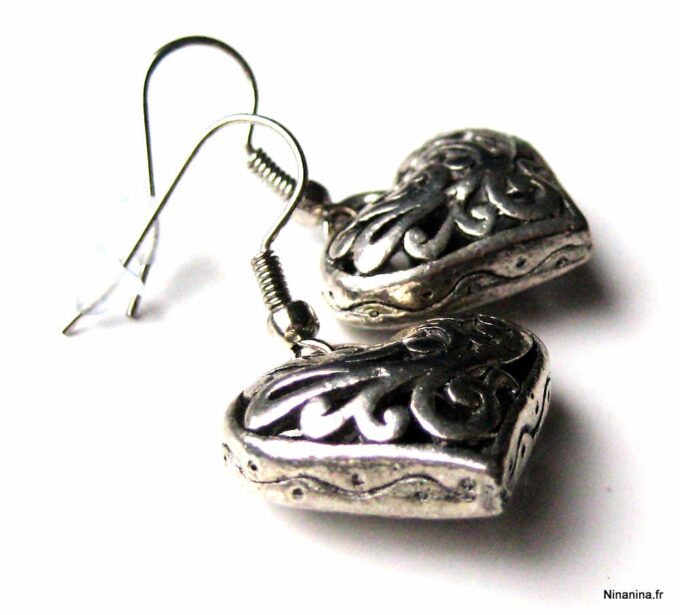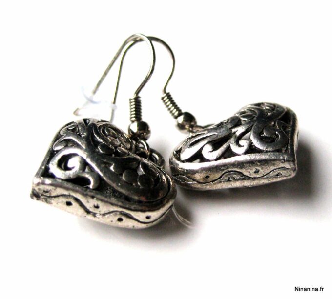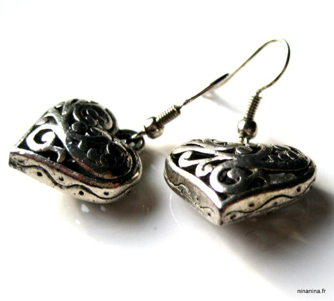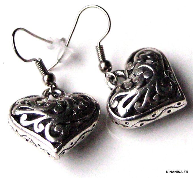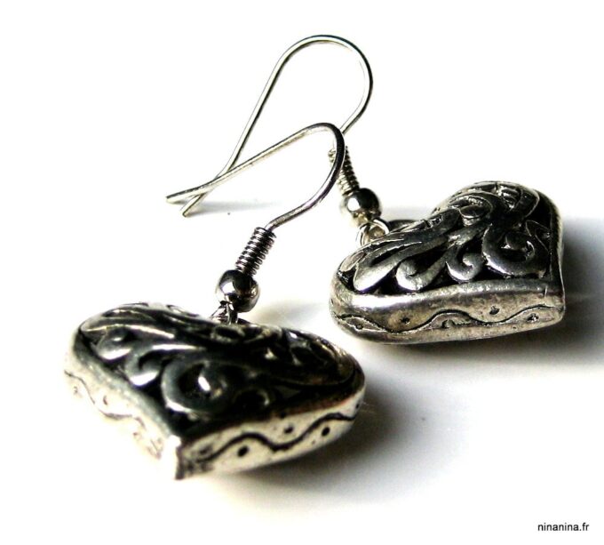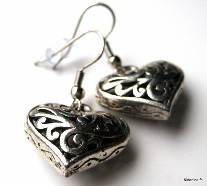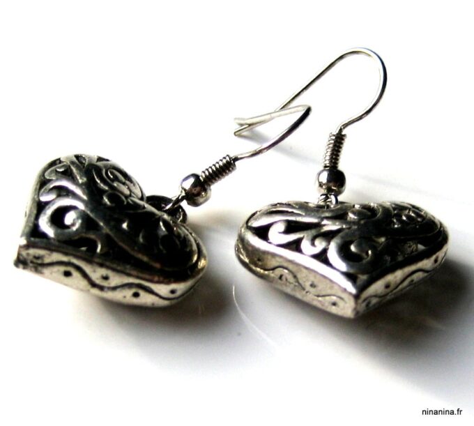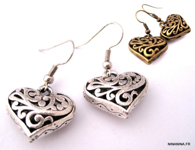 Boucles d’oreilles coeurs composées d’un pendentif coeur ciselé et bombé en métal argenté monté sur boucle pendante. Dim du pendentif : 2 X 2 cm. Existe également en métal bronze. Longueur totale : 3,5 cm environ. Livré dans sa pochette d’organza. Bijou 100% fait-main.