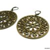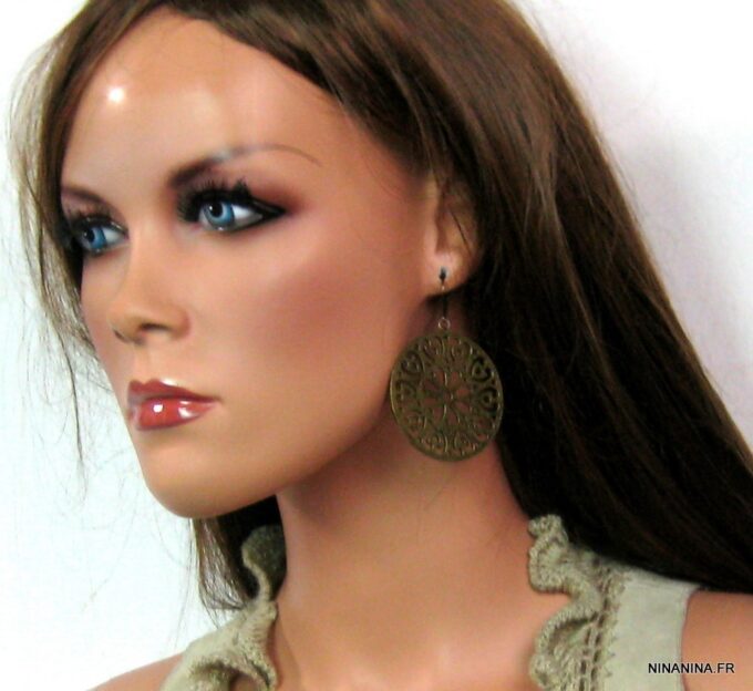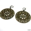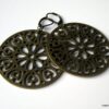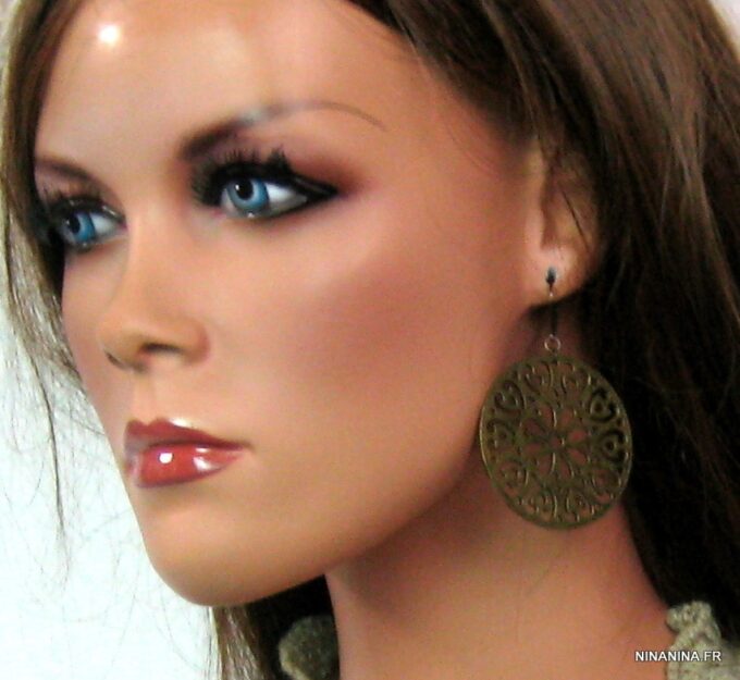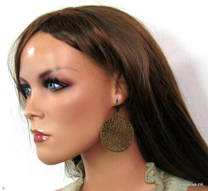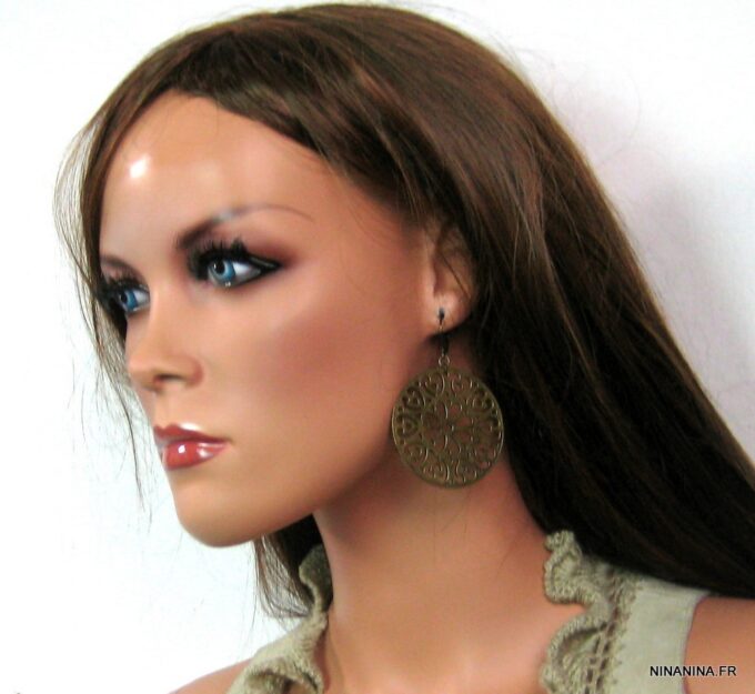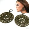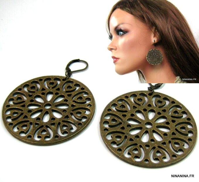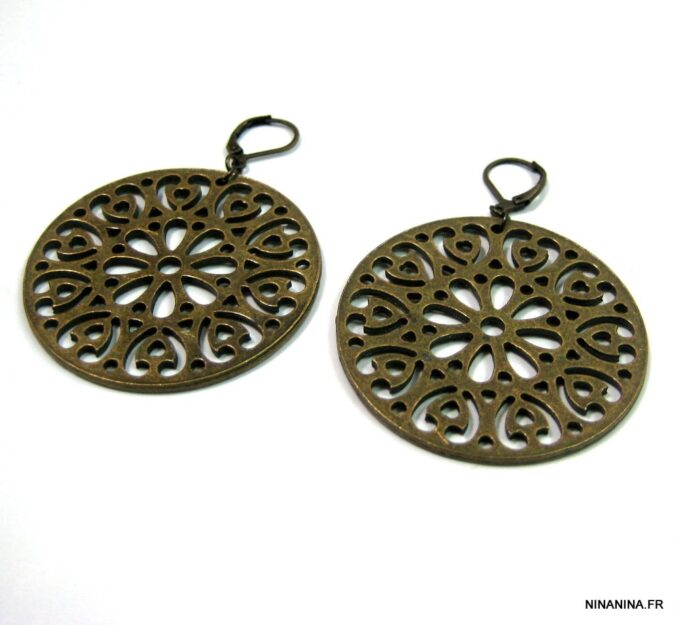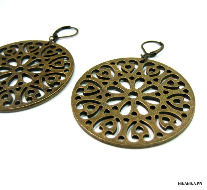 Boucles d’oreilles dormeuses pendentif rond métal bronze composées de pendentifs ronds ajourés en métal bronze montés sur boucles dormeuses. Diamètre des pendentifs : 4,7 cm env. Longueur totale : 6,5 cm env. Livré dans sa pochette d’organza. Bijou 100% fait-main.