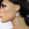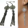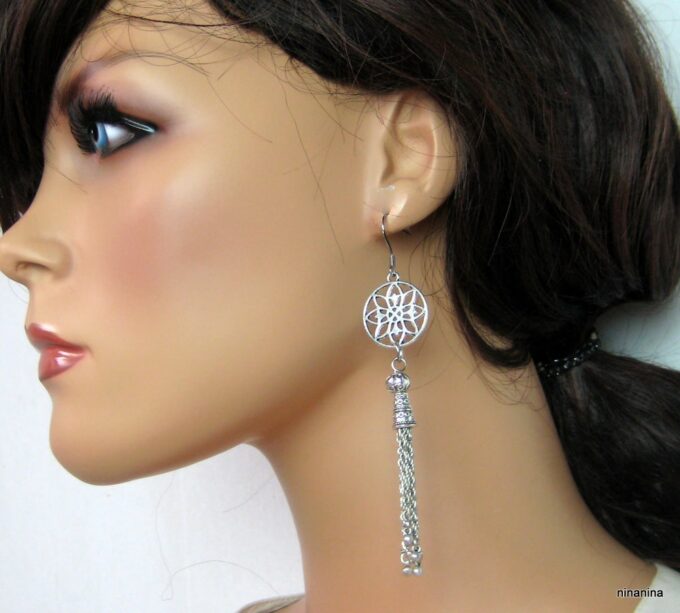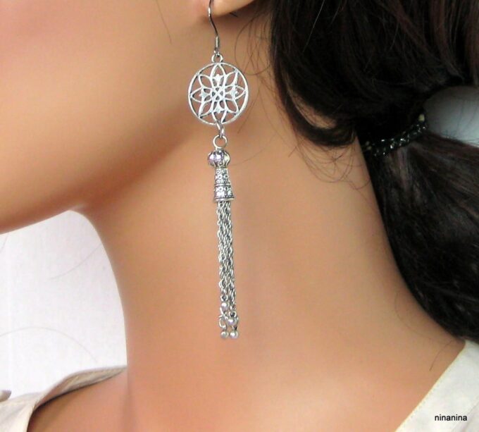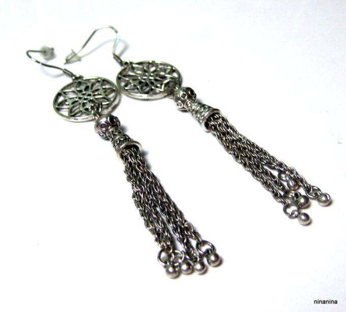 Boucles métal argenté pompon composées d’une estampe filigranée ronde et d’un pompon en métal argenté montés sur boucle pendante. Dim de l’estampe : 2,2 X 2 cm. Longueur (boucle comprise) : 10,5 cm environ. Livré dans sa pochette d’organza. Bijou 100% fait-main.