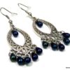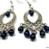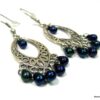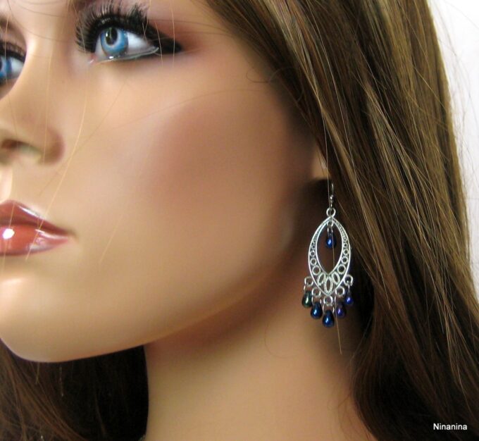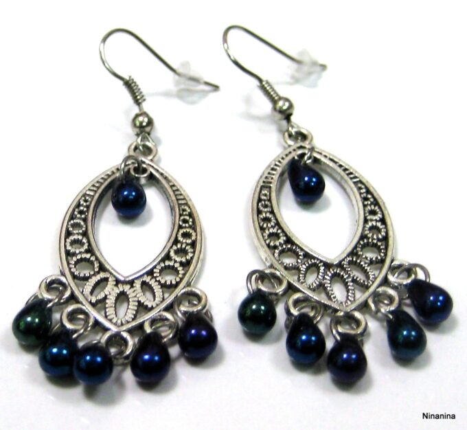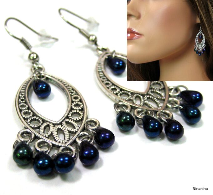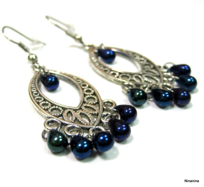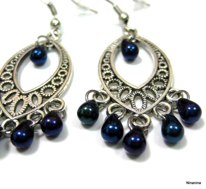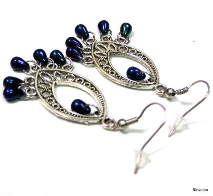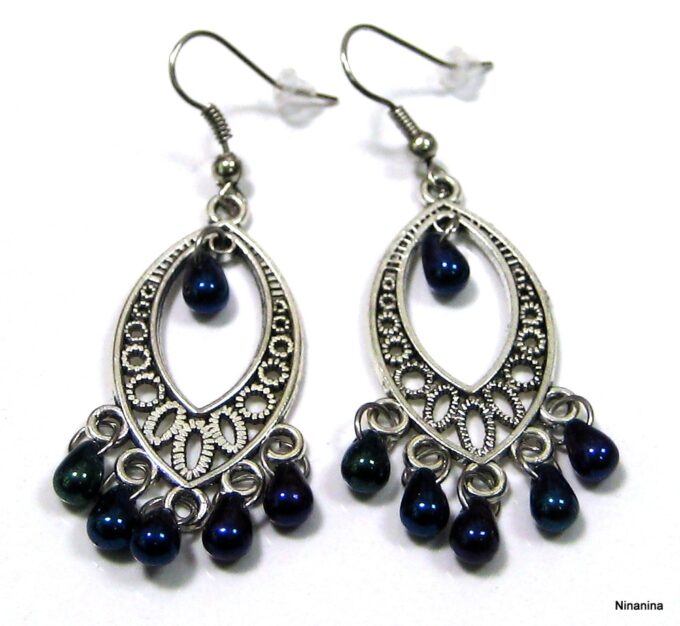 Boucles métal argenté et perles de verre composées de gouttes de verre turquoises montées sur une estampe ovale en métal argenté et boucles pendantes. Dim de l’estampe : 3,5 X 1,7 cm. Longueur (boucle comprise) : 6,4 cm environ. Livrées dans sa pochette d’organza. Bijou 100% fait-main.